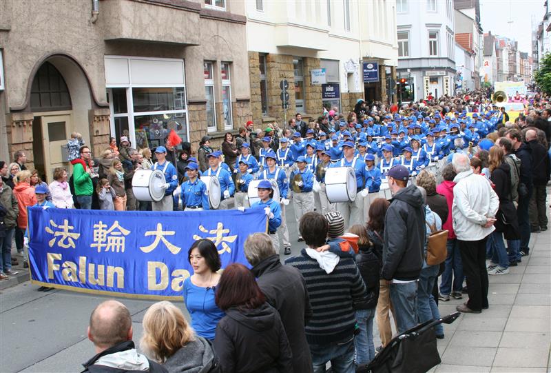 法轮功学员的游行队伍今年被安排在整个游行队列、近五十个游行团队的压轴队,从队列的安排已经感觉出法轮功队伍的“名牌效应”。今次的法轮功学员队伍仍由欧洲天国乐团打头阵,来自十三个国家的约八十名欧洲天国乐团法轮功学员,身着蓝色的古装,展现着东土中华的古风。天国乐团行进到哪里,街道两边总是举出好多相机,抢拍镜头。乐团所演奏的“法轮大法好”等曲目雄壮嘹亮而又优美动听,沿路两边观众欢欣鼓舞,他们鼓掌欢呼,有的还随着乐曲节拍踏步舞动。