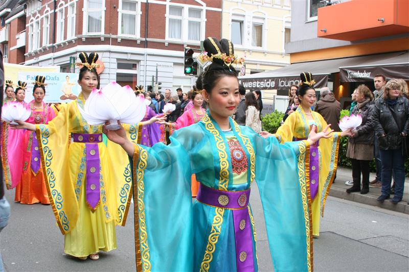 法轮功学员的游行队伍给人们带来的不仅仅是观感的美,而且也有心灵的震撼。这么美好的乐曲,这么美丽的服装,这么美妙的舞姿,这么祥和的功法,发源于中国,却在中国遭受惨烈的迫害!为什么?