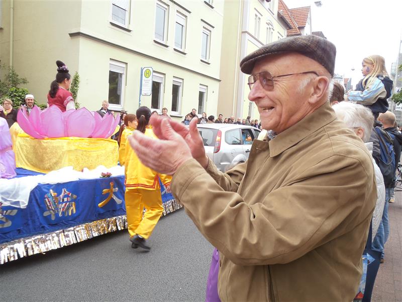 一位德国老人一直给法轮大法队列鼓掌:“实在太好了,都太好了!”