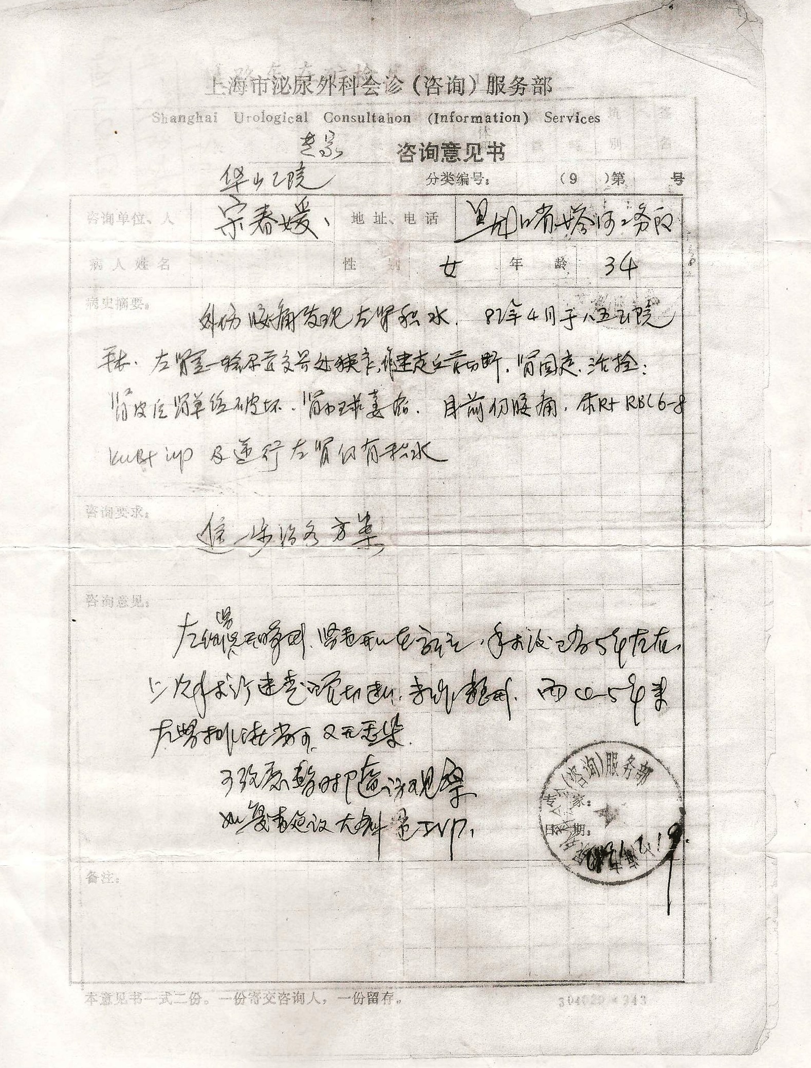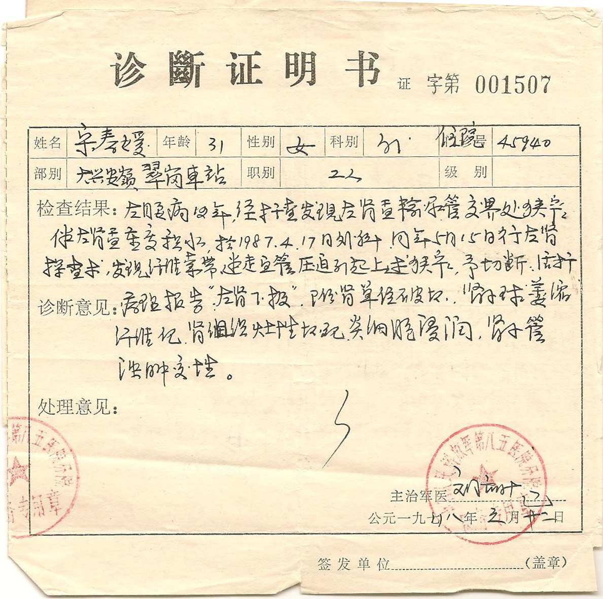 ![]() 宋春媛在上海华山医院的诊断书 | ![]() 宋春媛在上海军医医院的诊断书 |