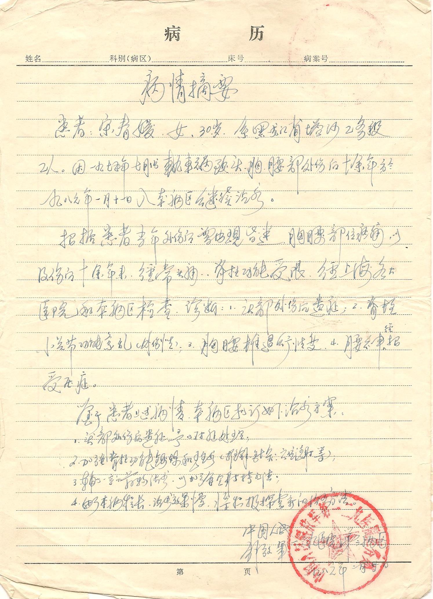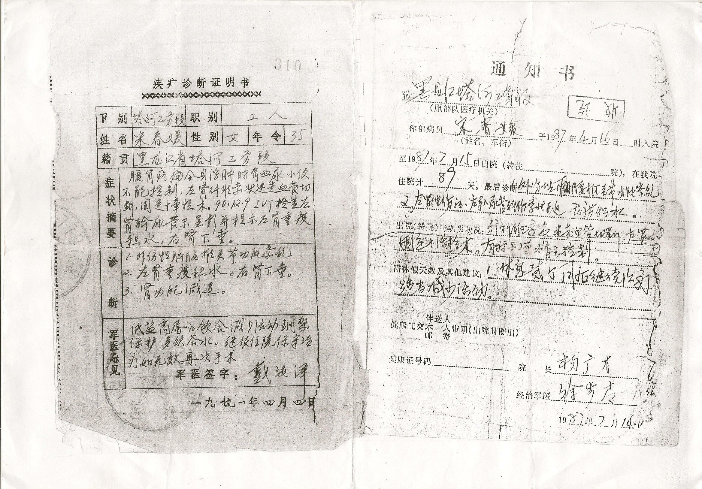 ![]() 宋春媛在解放军八五医院的诊断书 | ![]() 宋春媛在解放军一二九医院的病例 |