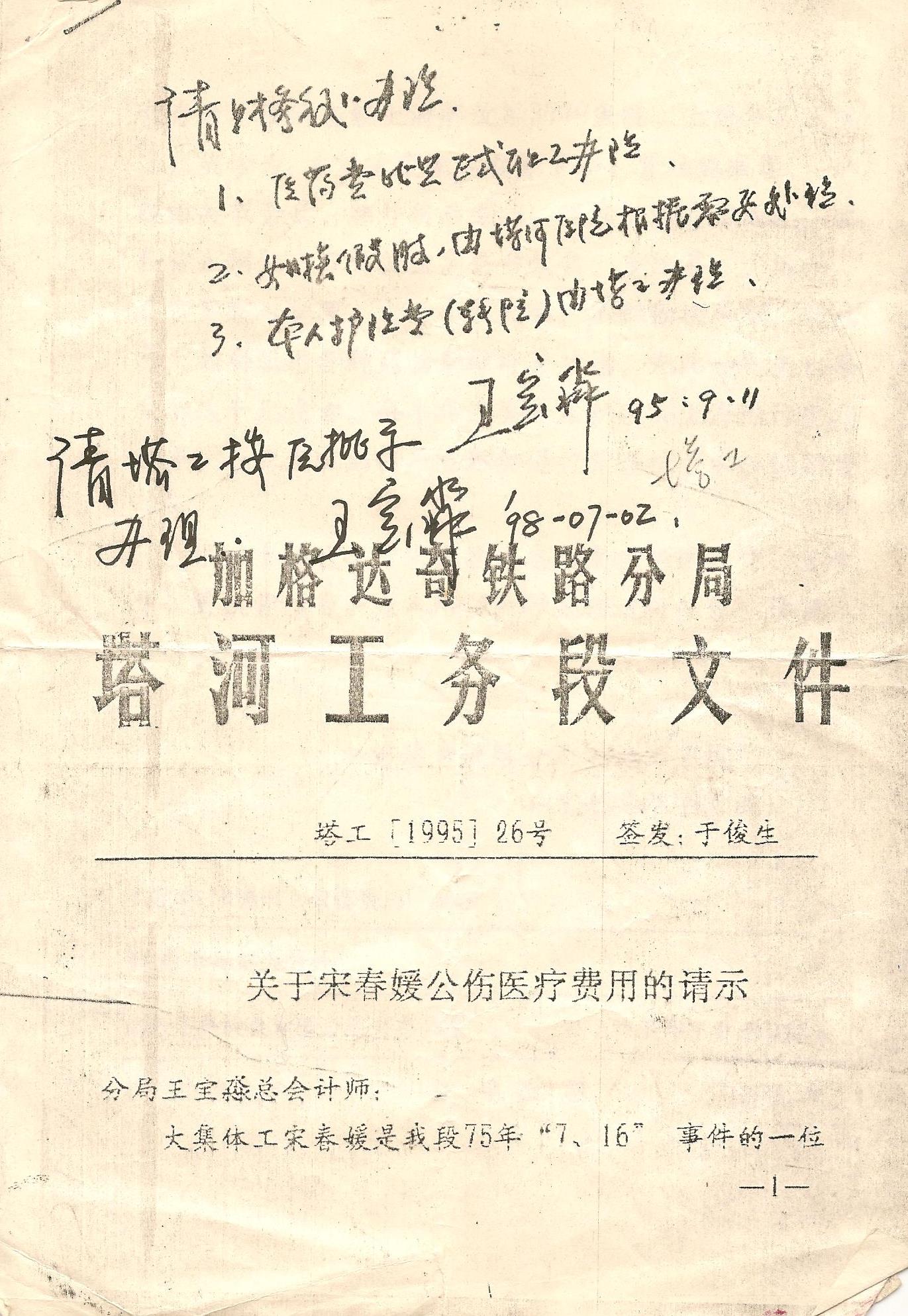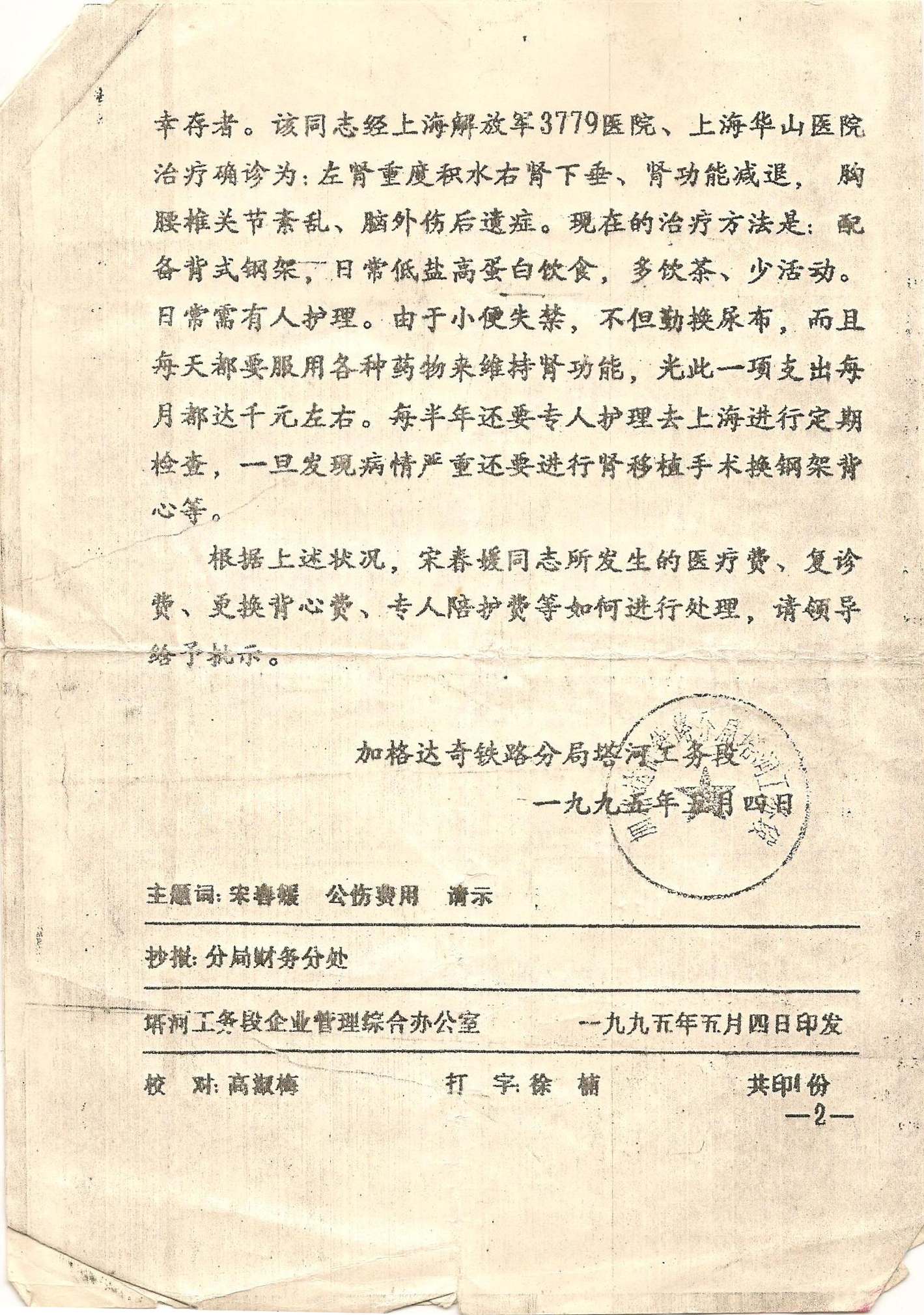 ![]() 《加格达奇铁路分局塔河工务段文件》关于宋春媛工伤医疗费用的批示第1页 | ![]() 《加格达奇铁路分局塔河工务段文件》关于宋春媛工伤医疗费用的批示第2页 |