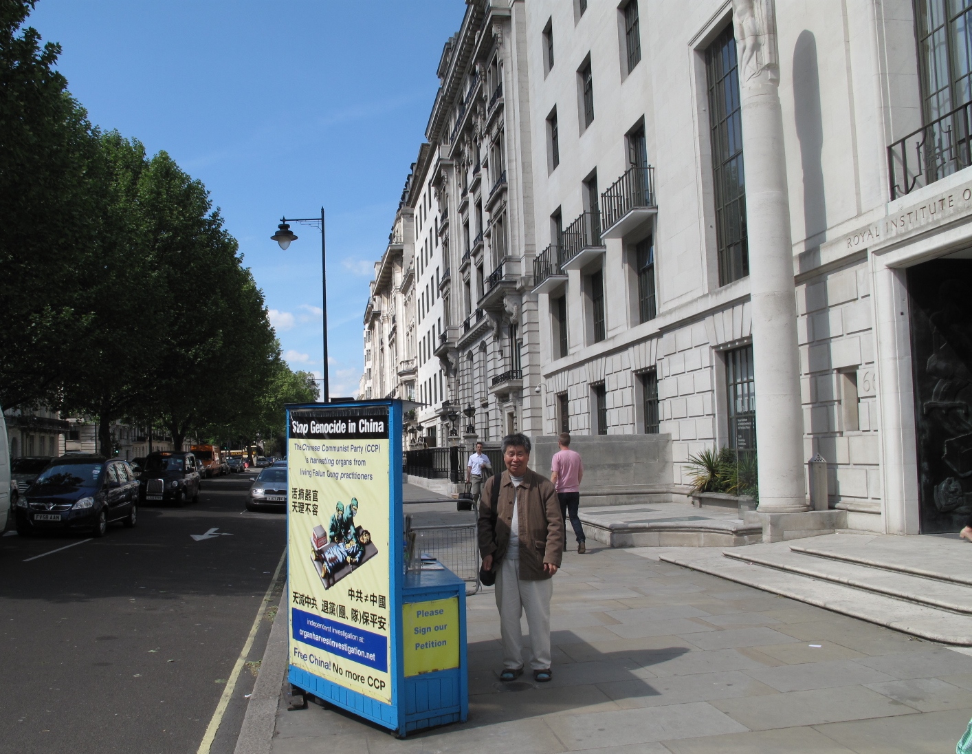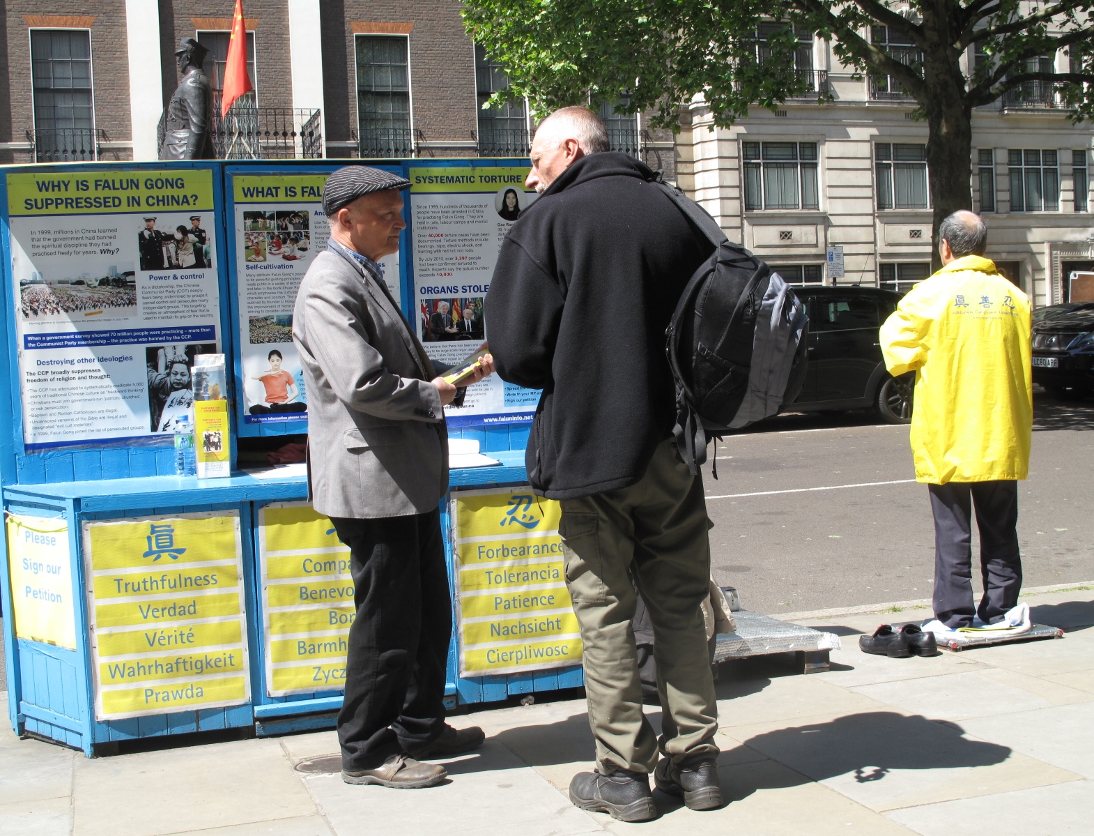 这天来接托尼班的是刘大叔,一位从中国大陆来到英国的七十多岁的老人,他参加法轮功学员中使馆前的抗议活动已有五年多了,每周定期值班两次,他表示他在这里静坐抗议时最大的愿望就是要求中共停止迫害法轮功,最感欣慰的就是看到有越来越多的人了解大法真相、对法轮功反迫害表示支持。他说:“在请愿书签字的人越来越多,都主动来签”。