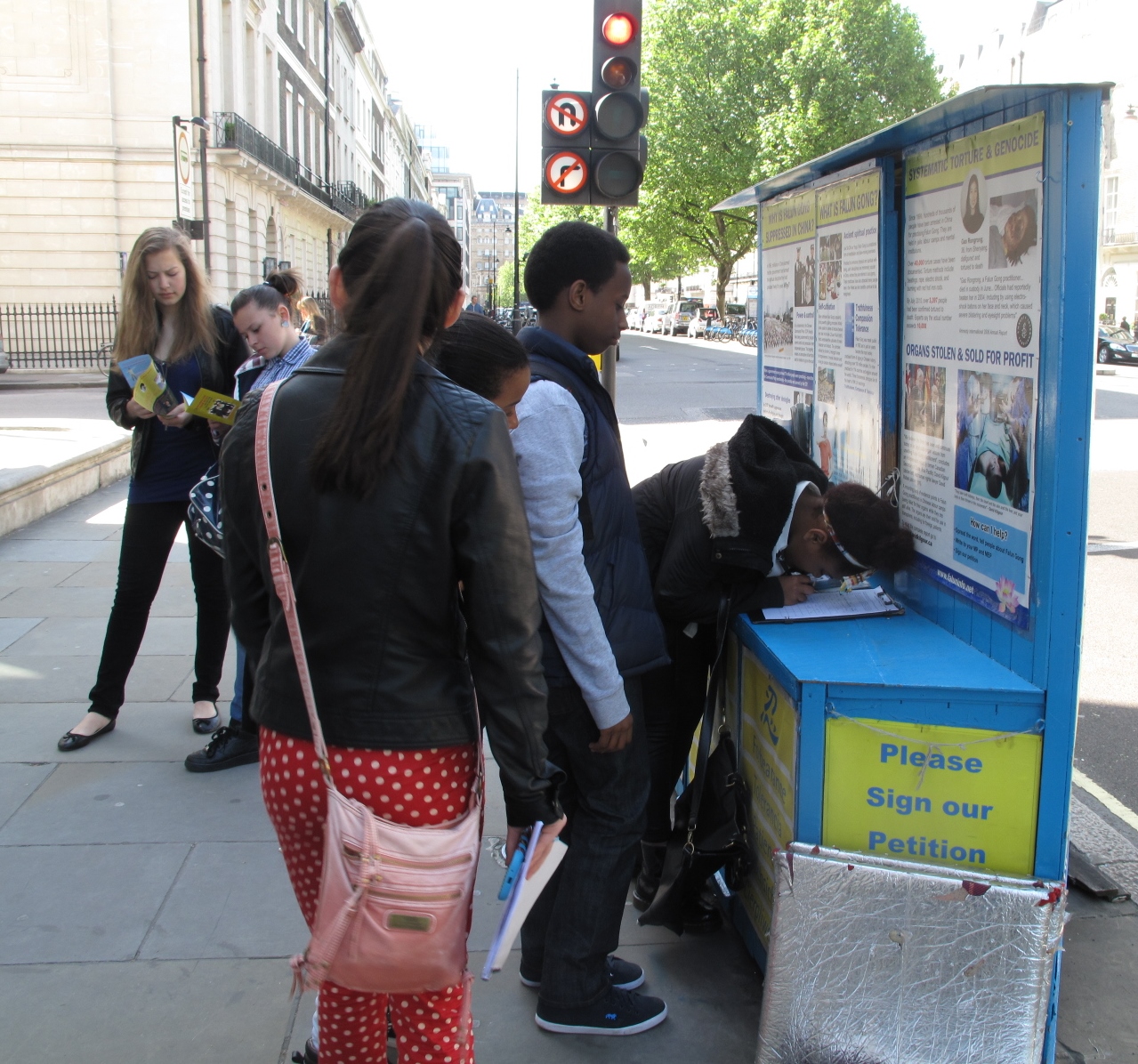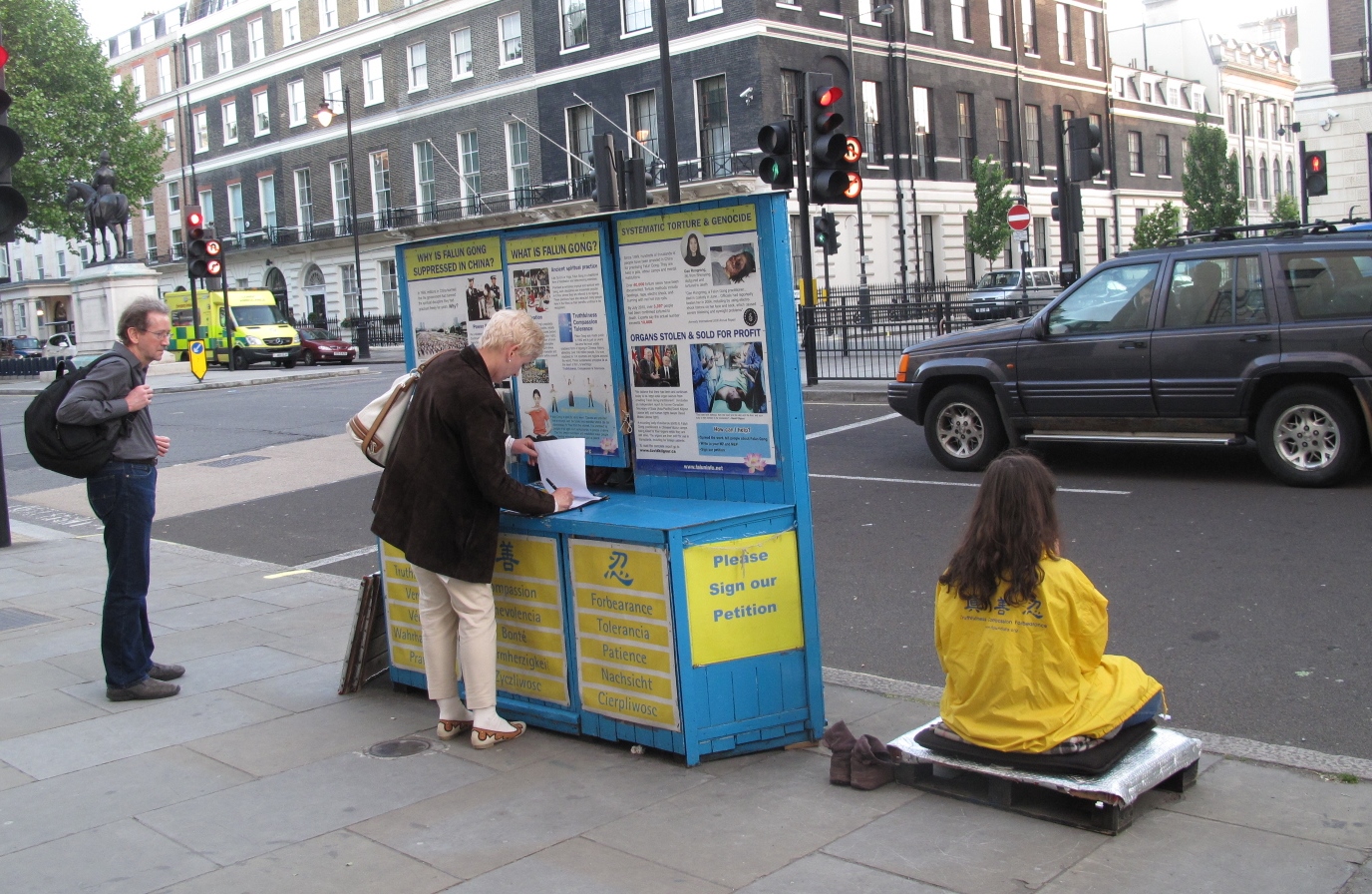 一天下来,在法轮功学员伦敦中使馆前的和平抗议活动现场征签表上又增添了二十多个签名,签名者的职业有艺术家、平面设计人士、物理学家、医生和护士等,也有一些学生。他们共同呼吁停止迫害法轮功,呼吁国际社会关注中共活摘法轮功学员器官牟利的反人类罪行。