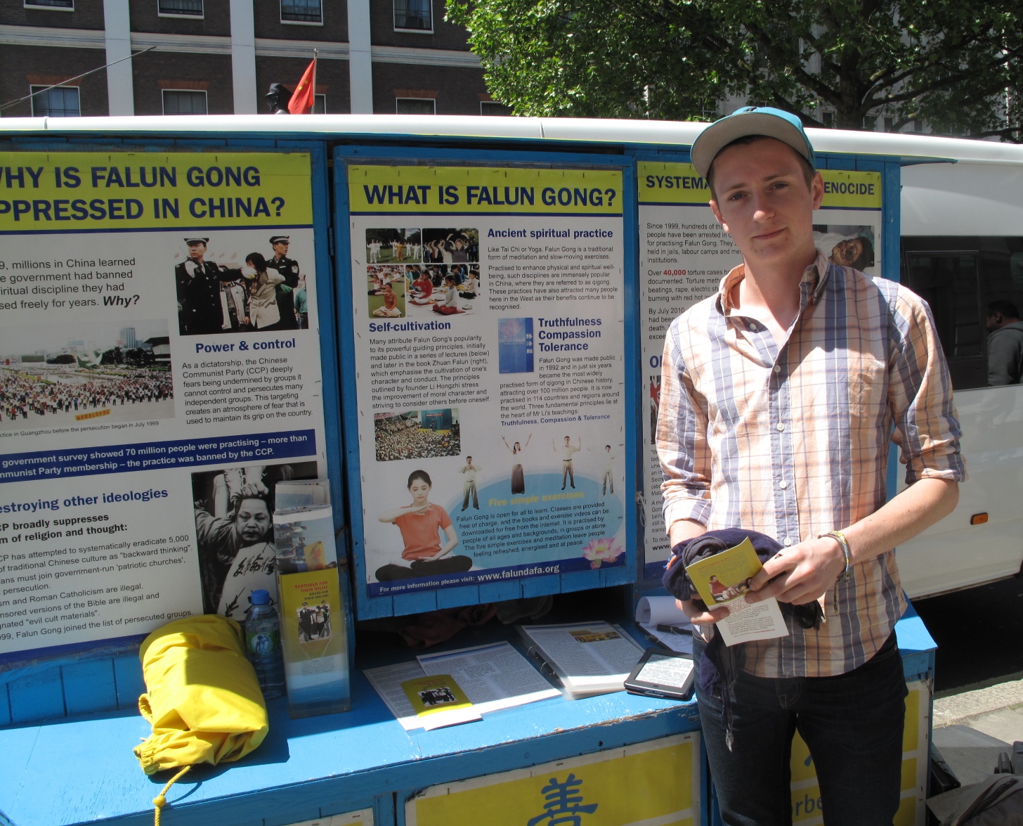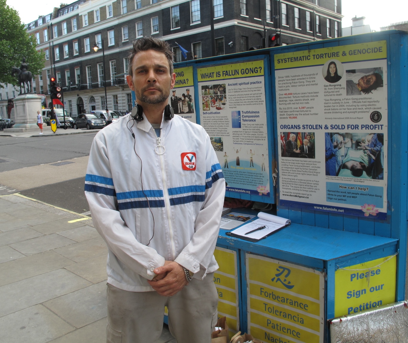 伦敦人托尼从二零零一年开始修炼法轮功,在过去的十一年中,托尼一直坚持每周一次或多次参与英国法轮功学员二十四小时不间断和平抗议活动。六月五日这天,托尼从早九点到下午一点值班。问到托尼他最初来参加时的动力是什么,他坦说那时他开始接触法轮功不久,初步的修炼尝试让他体会到法轮大法的美好,认识到法轮功的“真善忍”原则会鼓励陷于困境的人类走上正途、走向美好,他觉得有必要把这个发现告诉更多人,他不能理解中共为什么要打压迫害法轮功,他不能容忍自己和西方政府和媒体一样对中共政府无理打压法轮功保持沉默,他说:“一开始我的努力不太被理解和接受,常常有人问我一个英国人为什么管中国人的事儿,但我还是坚持认为这样做很重要。”“你从这里的媒体和政府那都听不到法轮功的真实信息,大家故意保持沉默,这样,我们法轮功学员不得不出来发声。我就是要向人们传递这样的信息:法轮功与我们每个人都有关,不只是中国人的事儿,法轮功事关整个人类未来。”