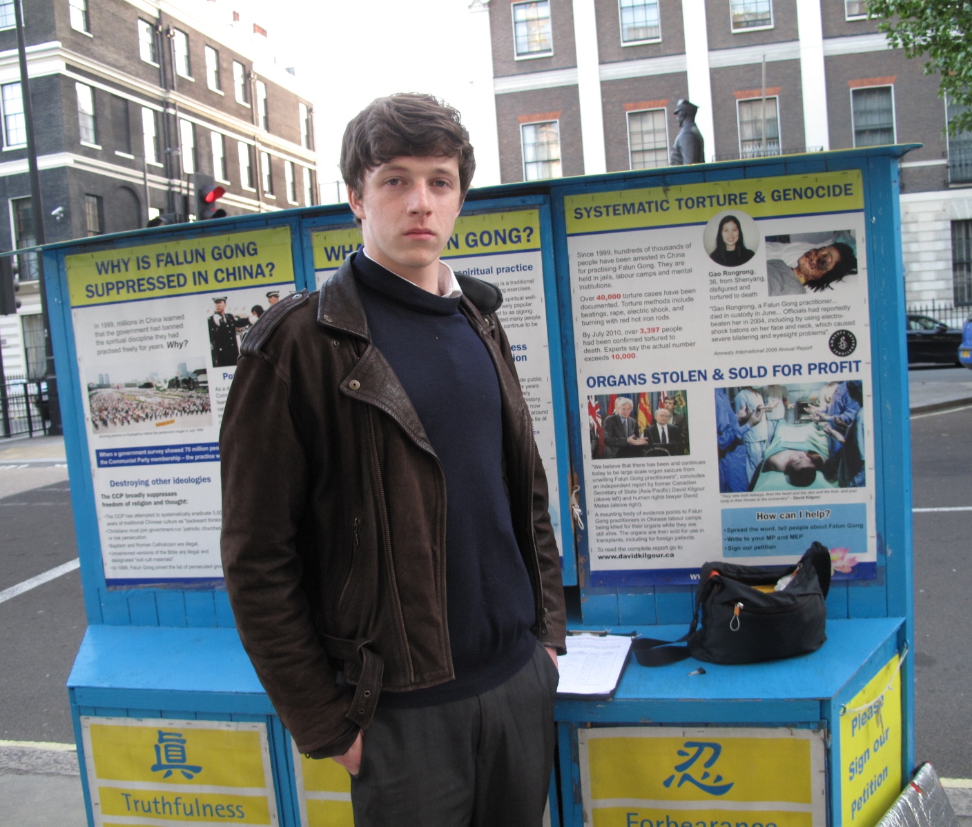 从事平面设计的艾伦(Alan Niederhauser)经常经过法轮功学员伦敦中使馆前的和平抗议场地,曾经驻足听过法轮功学员讲真相,这一天,他在真相展板前再次驻足与法轮功学员交谈,接着他第一次在法轮功反迫害征签表上签字并表示要进一步了解法轮功、去尝试法轮功功法。他说:“他们表面上冠冕堂皇地向国际社会表示要改善人权,实际上他们根本不在乎人权、为所欲为。”“法轮功学员只想要‘真善忍’,中共却用枪和武器对待他们,中共的恐惧一清二楚。”