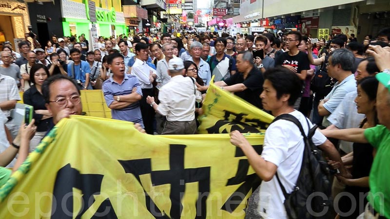 ![]() 六月二日,恶党团伙侵扰旺角行人专用区的法轮功真相点,激起极大民愤。青关会头目林国安(穿深蓝色衣服手持横幅)受到民众强烈谴责 |