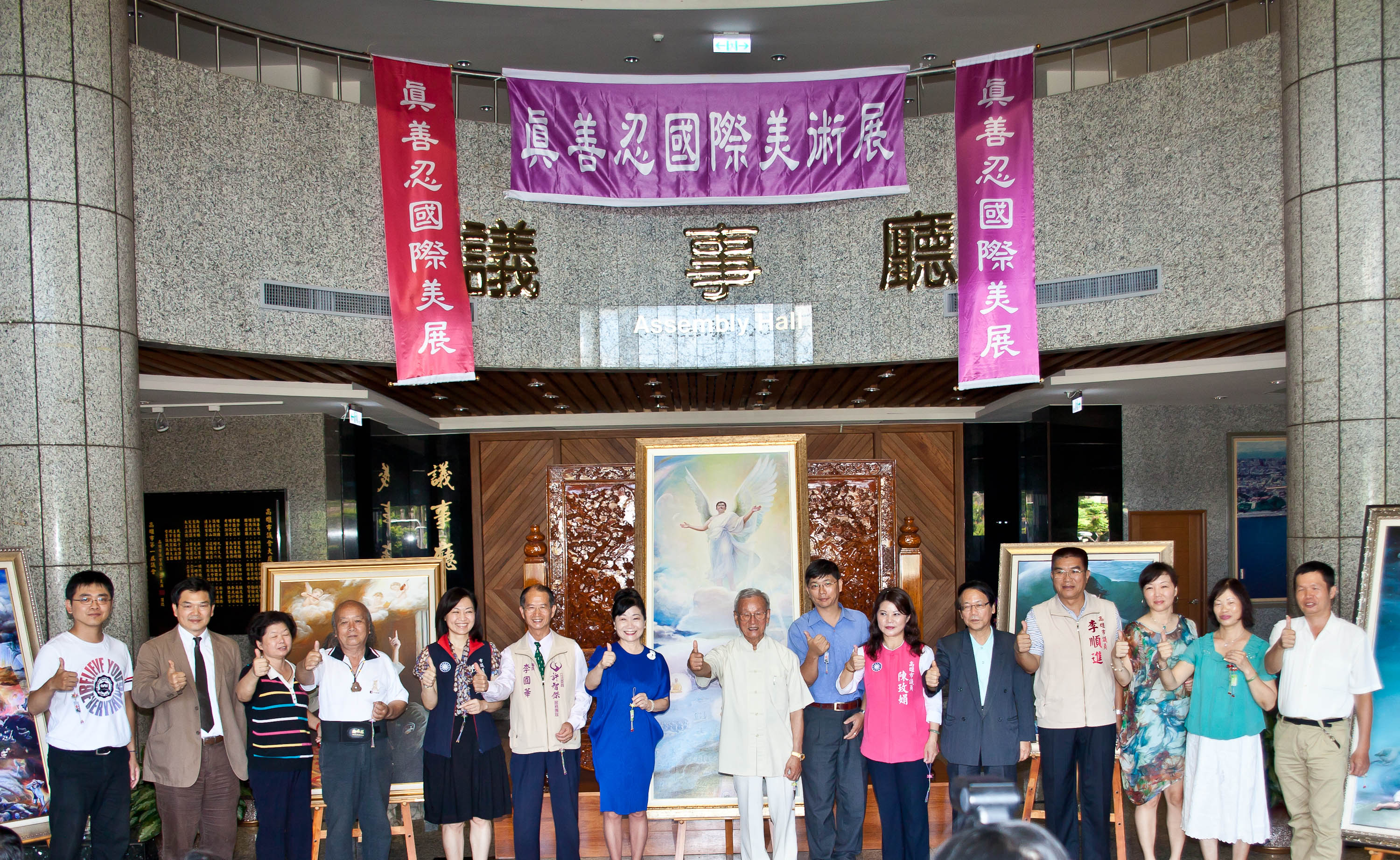 ![]() 图 1:“真善忍国际美展”于二零一三年六月二日在高雄市议会举办揭画茶会。 |