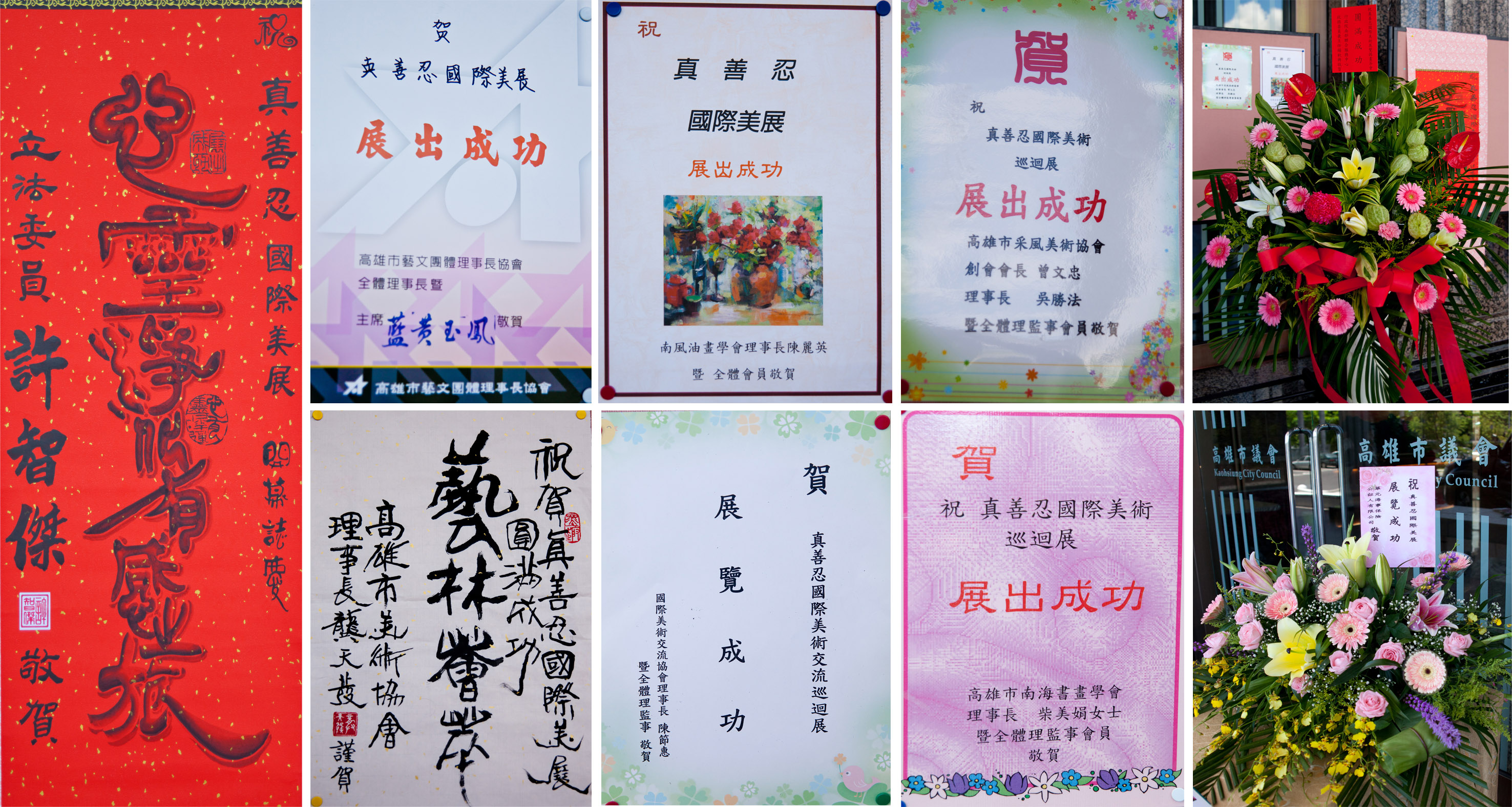 ![]() 图2:多个艺术界画会理事长、政要发来贺词和鲜花,祝贺真善忍美展在高雄市议会展出成功。 |