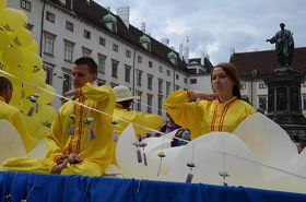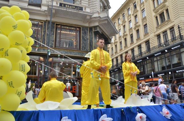 游行于下午一点开始。浩浩荡荡的队伍由白衣方阵的学员拿着被中共迫害致死的学员遗像,各种法轮功真相横幅方阵,花车上展示法轮功五套功法,以及揭露中共活摘器官演示组成,在当地警察的护卫和配合下从瑞典广场(Schwedenplatz)出发,一路经过繁华的市中心商业区以及著名景点,并环绕中国市场的主要街道,最后行至史蒂芬广场的信息台,历时将近三个小时,吸引了大量游客以及街道两旁的商家前来了解法轮大法真相。很多人从学员手中接过传单,认真阅读。