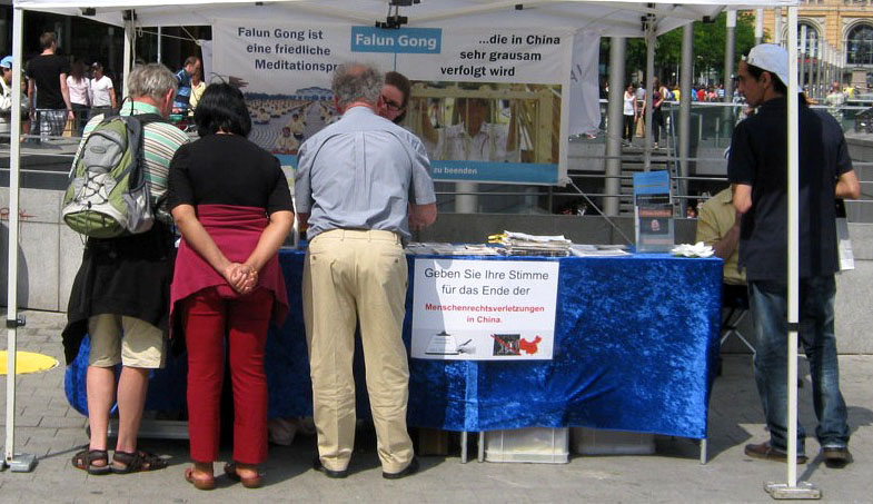 一对老年夫妇正在汉诺威旅游。老先生经常去中国出差。对于在中国发生的这些罪恶,他们先是感到很错愕,但因为对于东德共产党的影响及其带来的恐惧非常了解,在与法轮功学员长谈之后,他们在呼吁制止迫害的请愿书上签名。