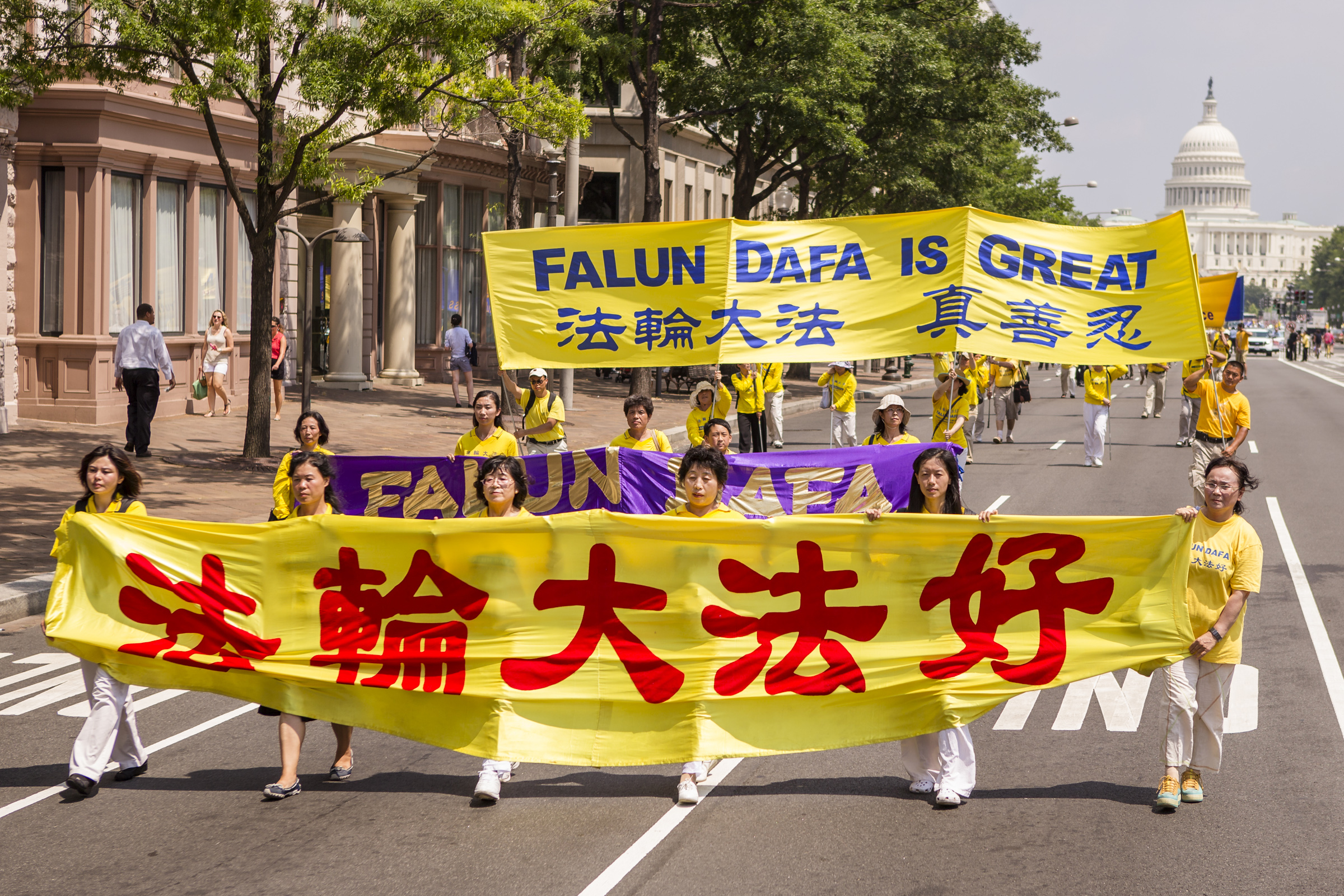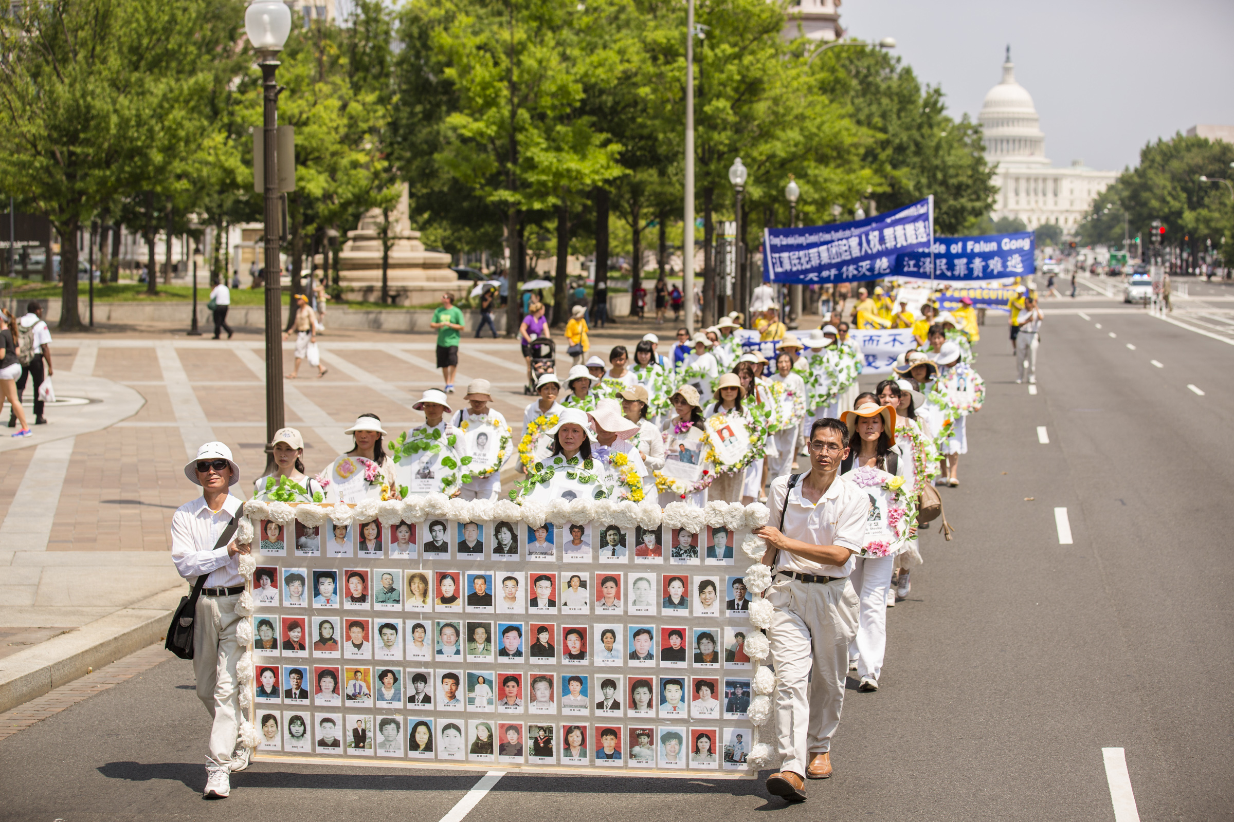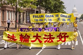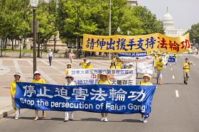 集会之后是声势浩大的游行。“真善忍”、“法轮大法好”、“停止迫害法轮功”、“法轮大法弘传世界”,法轮功学员高举着一排排横幅庄严肃穆地行进在美国国会与华盛顿纪念碑间这条美国首都的主干道上。