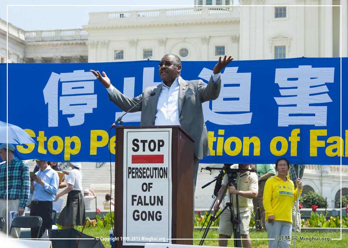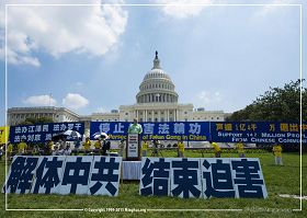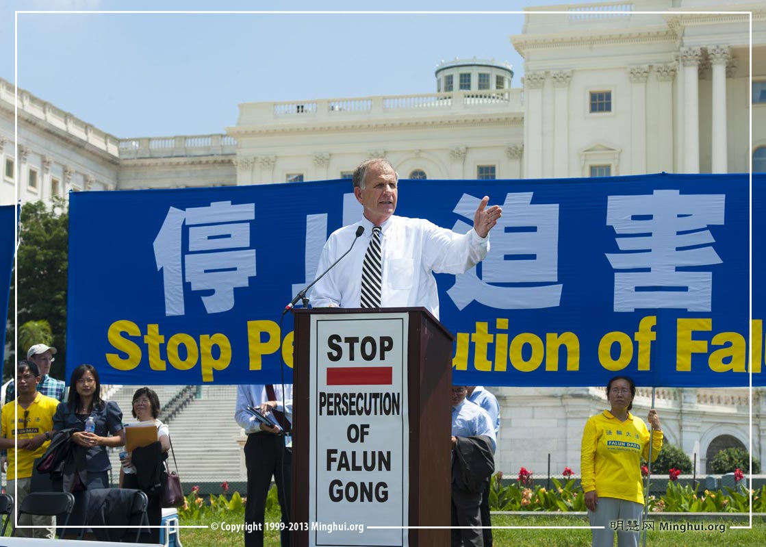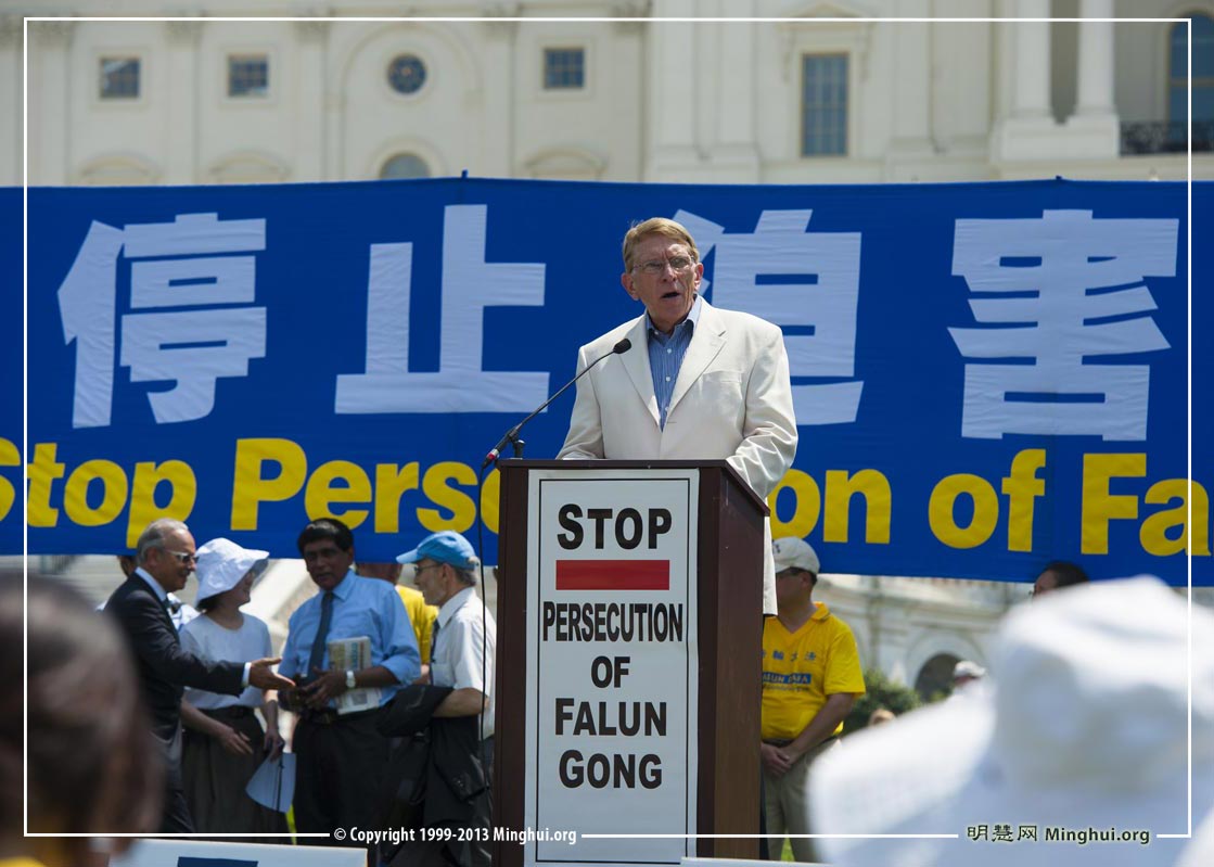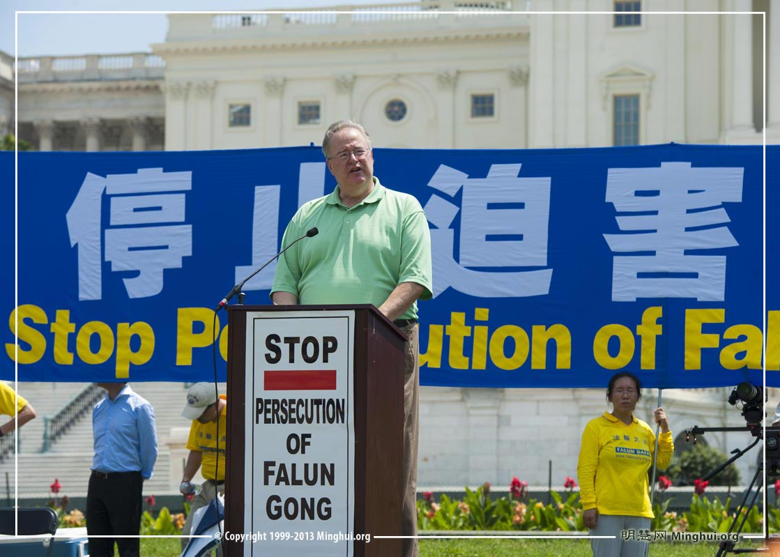 集会当天华盛顿的气温接近一百华氏度。代表德州的美国联邦众议员特德·坡(Rep. Ted Poe)在集会上说:“华盛顿国会山现在很热,但是我想告诉大家的是,我们要让中共政权处于火热之中,为了惩罚它们对法轮功学员犯下的恶行, 直到中共明白一个根本事实:别干涉法轮功学员,不然那里会越来越热。 ”