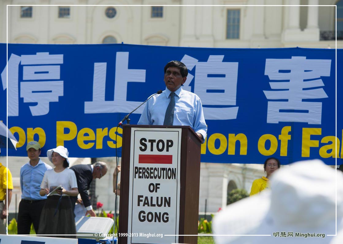 国际大赦美国分部国际宣导主任提·库玛博士(Dr. T. Kumar,Amnesty International USA)在集会上对法轮功学员在中国遭受的长期而持续的人权迫害表示关切。
