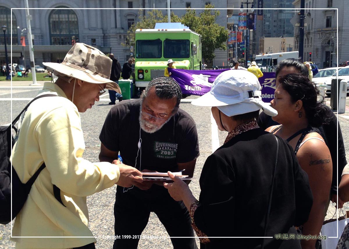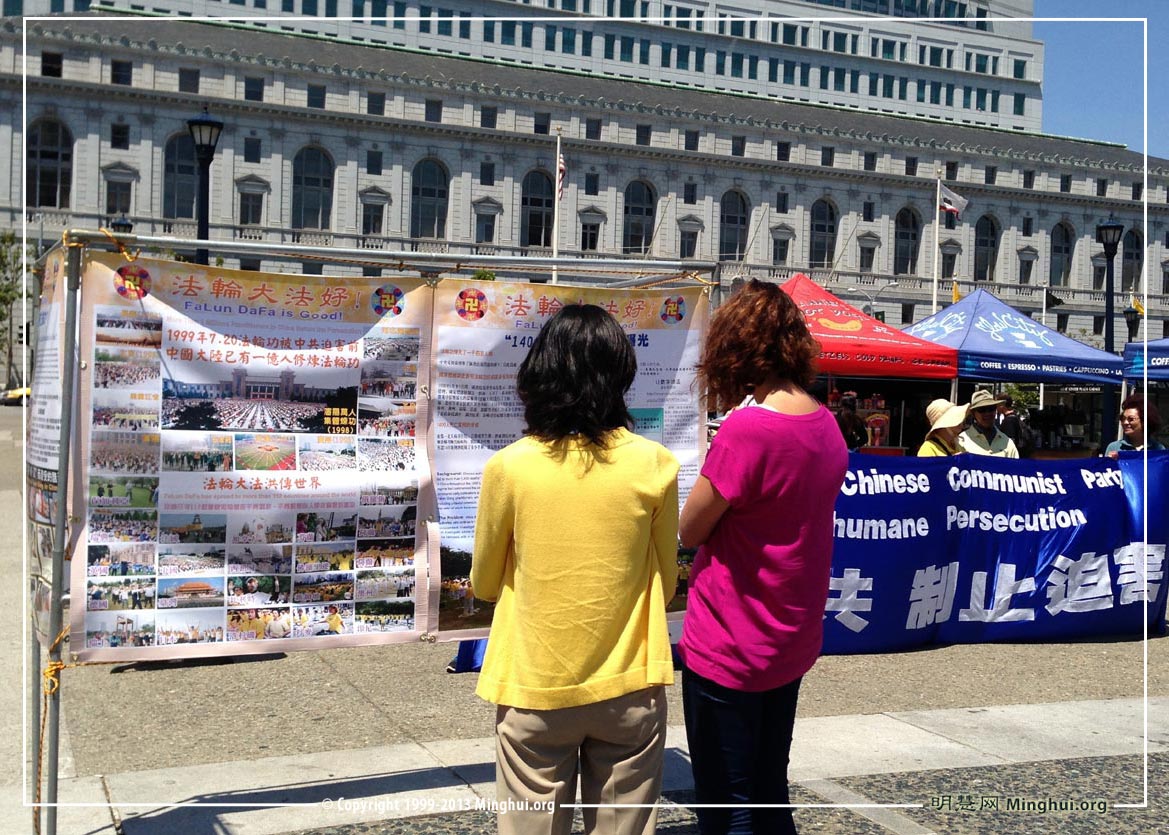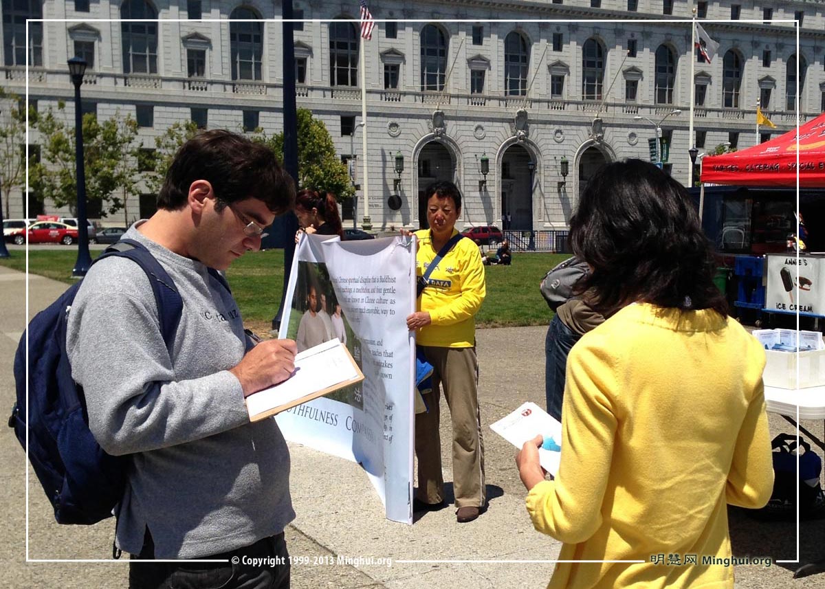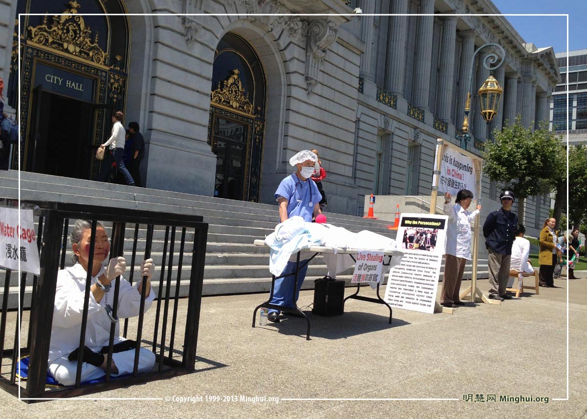 旧金山市政府不但是政府官员办公之地,也是著名旅游点之一,每天都有大批来自各阶层的民众进出。当天,法轮功学员以真人演示“活摘器官”,以及“水牢”、“吊挂”和“老虎凳”三种酷刑。曾经在旧金山交响乐工作的马力欧(Mario)特意走到学员面前说:“你们在这里告诉人们这些真相很重要,很有意义!人们必须知道这些真相。”