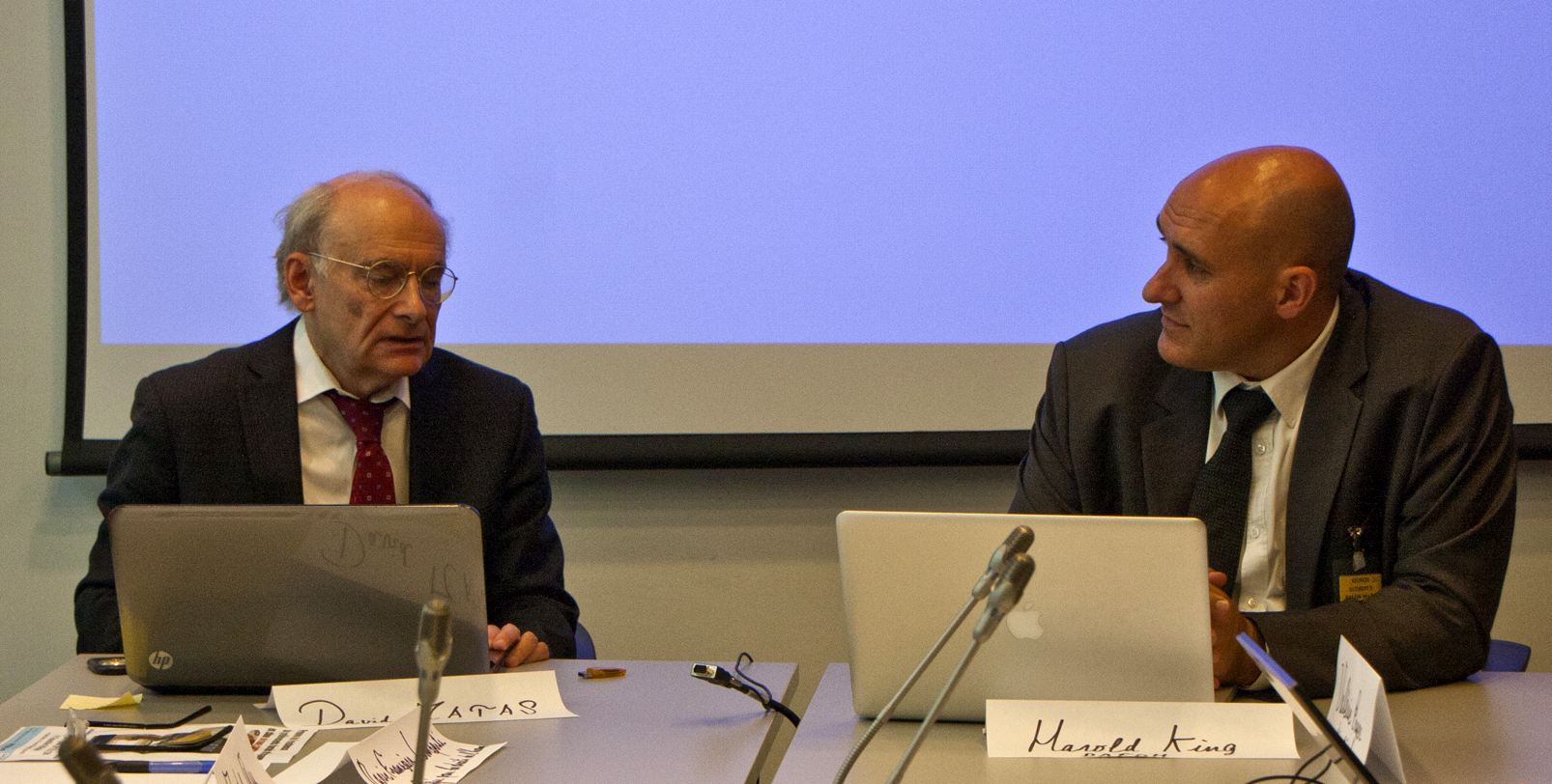 加拿大人权律师大卫•麦塔斯先生(左)和会议主持人、“反对强制摘取器官医生协会”代表哈罗德•金先生(右)。
