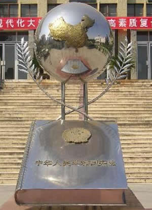 江泽民这伙流氓加法盲,把个人意志(即中共的政治)强加在宪法之上。位于陕西省西安市的西北政法大学曾经有一雕塑(见下图),人们戏称为“宪法顶个球”,因为其含有讽刺中共的意思,后来被拆除了。