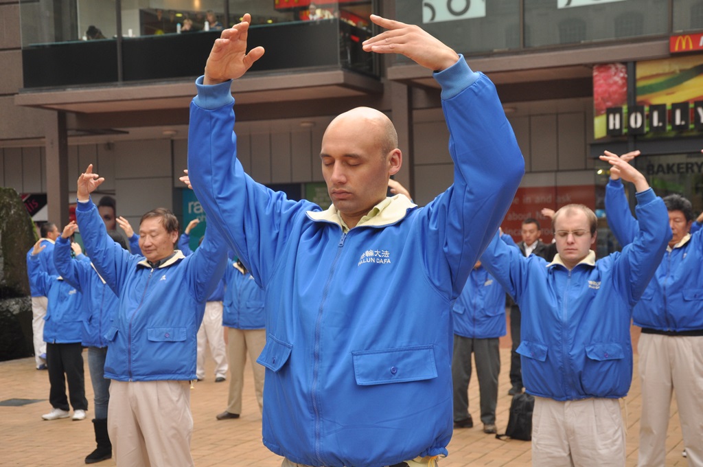 ![]() 法轮功学员在集会现场進行功法展示。 |