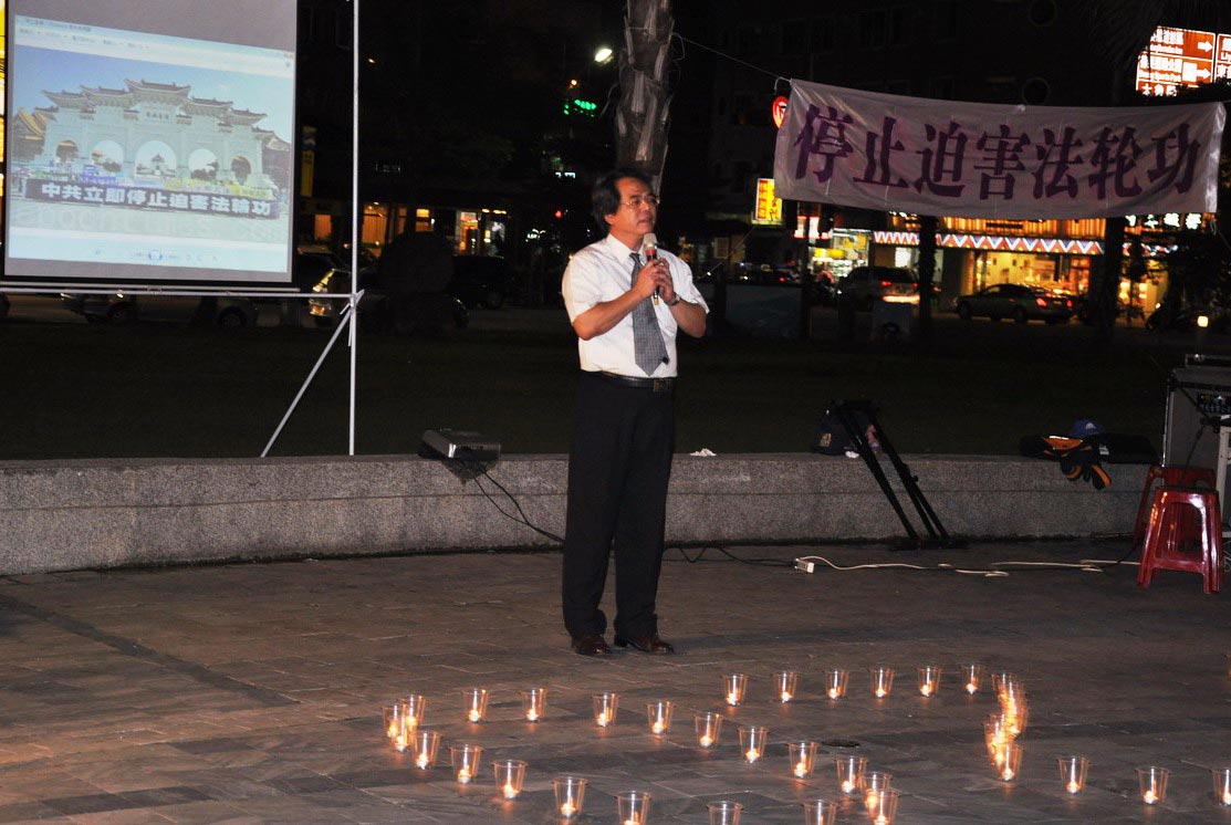 花莲市公所机要秘书王森园代表花莲市长田智宣参加烛光悼念会,王专员表示不信真理唤不回,从一九九九年七月二十日中共开始迫害法轮功,至今已经十四年了,一直以来从未停止迫害。他严正的要求中共当局停止迫害法轮功。