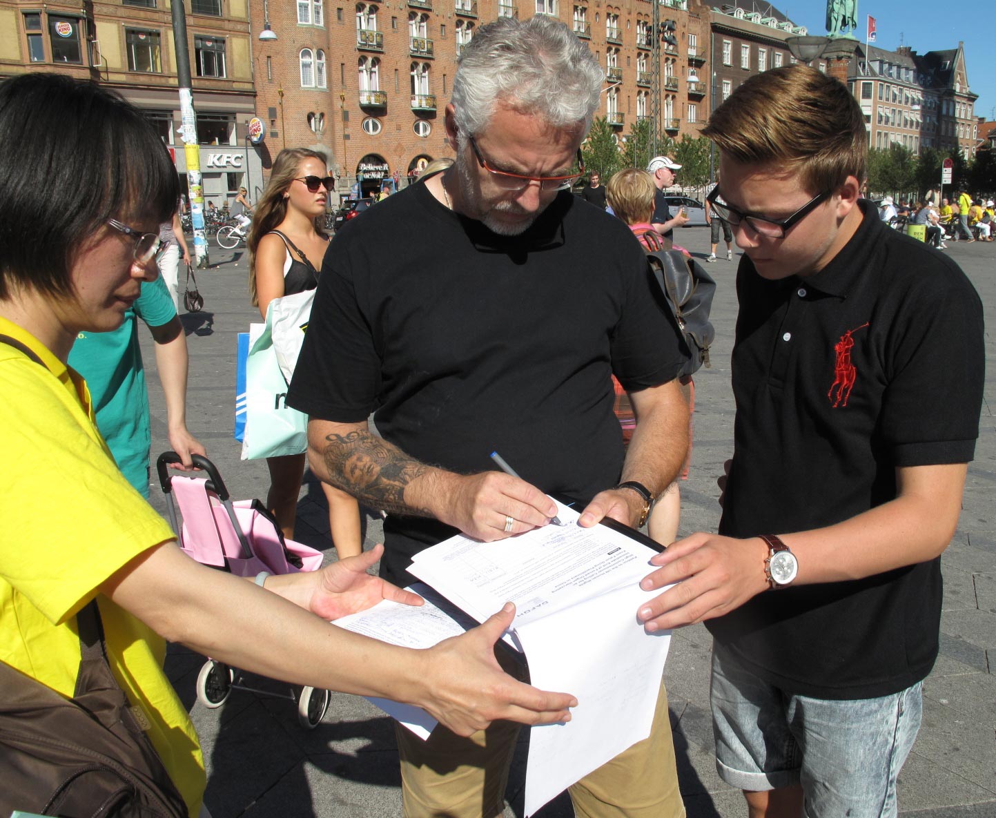 集会上,共有八位代表先后发言,整个过程中天国乐团五度演奏乐曲助阵。大规模的集会场面让经过市政厅广场的哥本哈根各界民众以及来自世界各地的游客受到强烈震撼,很多人停下脚步聆听天国乐团的演奏、发言以及法轮功学员的面对面讲真相。随着集会的進行,人们纷纷在反活摘器官征签表上签名,谴责中共迫害,选择和法轮功学员站在一起维护信仰自由和道德良知。