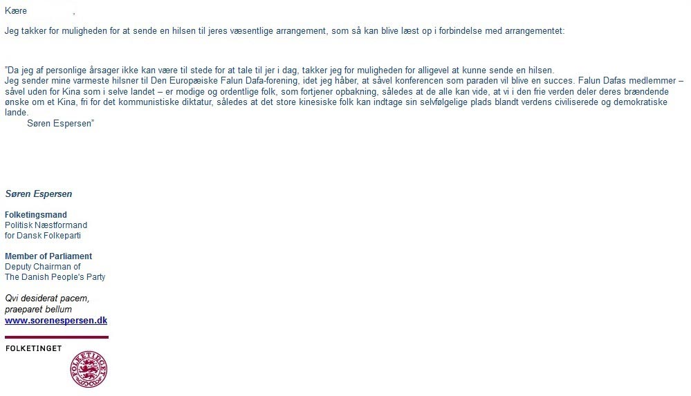 ![]() 丹麦国会议员、丹麦人民党副主席索伦?艾斯普森议员给法轮功学员的支持信 |
