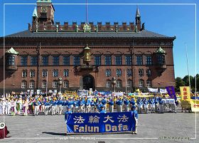 刚刚结束在哥本哈根市中心大规模环城游行的近千位法轮功学员直接在市政厅广场上摆出了声势浩大的阵势,站在整个队伍最前面的天国乐团气势如虹,轮流演奏“法轮大法好”、“法轮圣王”、“法正乾坤”、“法鼓法号震十方”、“送宝”、“欢乐颂”、“阿依达”等八首乐曲。法轮功学员举起的众多横幅一层一层地排列,汇成一道真相长城,横幅上的中文、英文、丹麦文都引人注目、直击人心,其中最重要的文字包括:“立即结束迫害法轮功”、“解体中共 结束迫害”、“天灭中共”、“退出党团队保命保平安”以及“法办江泽民、罗干、刘京、周永康”等 。