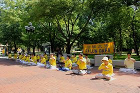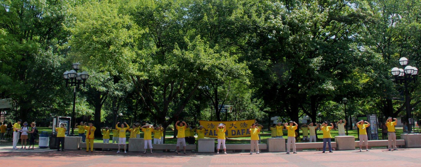 集会约在下午三点半开始,進行了近两个小时。这是阳光最足、气温最高的两个小时,骄阳似火,但队伍覆盖大半个广场的法轮功学员不畏骄阳酷暑,个个笔直地站立着,凸显修炼人超凡的耐性与严谨和自律。