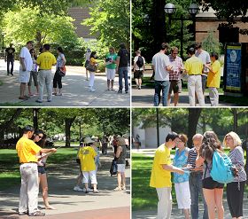 充满正义感的两名西人学生在征签板上签名。泰勒(Taylor)说:“我认为这场迫害已达到残忍的最顶峰,这是杀人啊,将人们从关心他们的家人和朋友身边带走并杀害。这是我听过世上最不公平的事情,太可怕了。我要尽我所能的帮助停止这场迫害。”