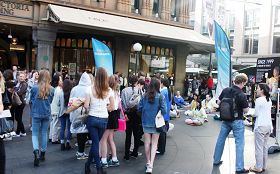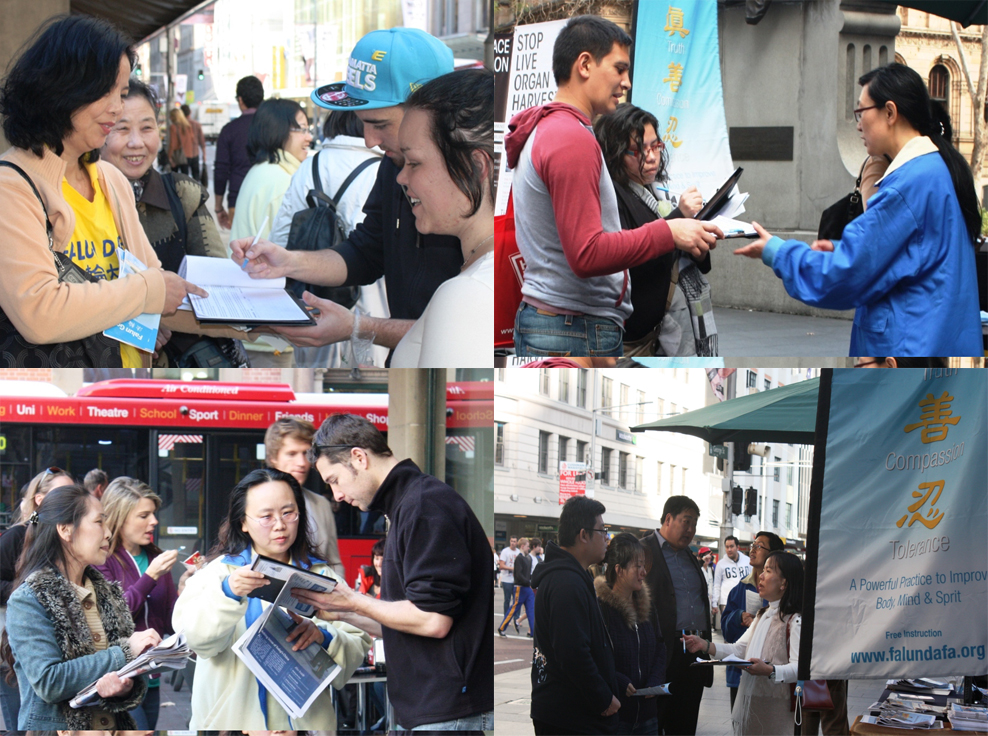 当日活动在热闹的市区,很多澳洲民众签名,呼吁澳洲政府采取行动制止中共活摘器官罪行。特别当他们听到今年早些时候悉尼民众为制止中共活摘法轮功学员器官的罪行,在极短时间内搜集到创纪录的十万以上签名支持时,更感受到这份支持的力量,欣然签名希望加上自己的一份力量。一位亚裔女士刚开始不知何事不愿意签名,但听说是为支持法轮功学员制止中共活摘器官罪行时,她眼泪都流出来了,马上签名支持。