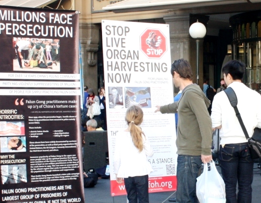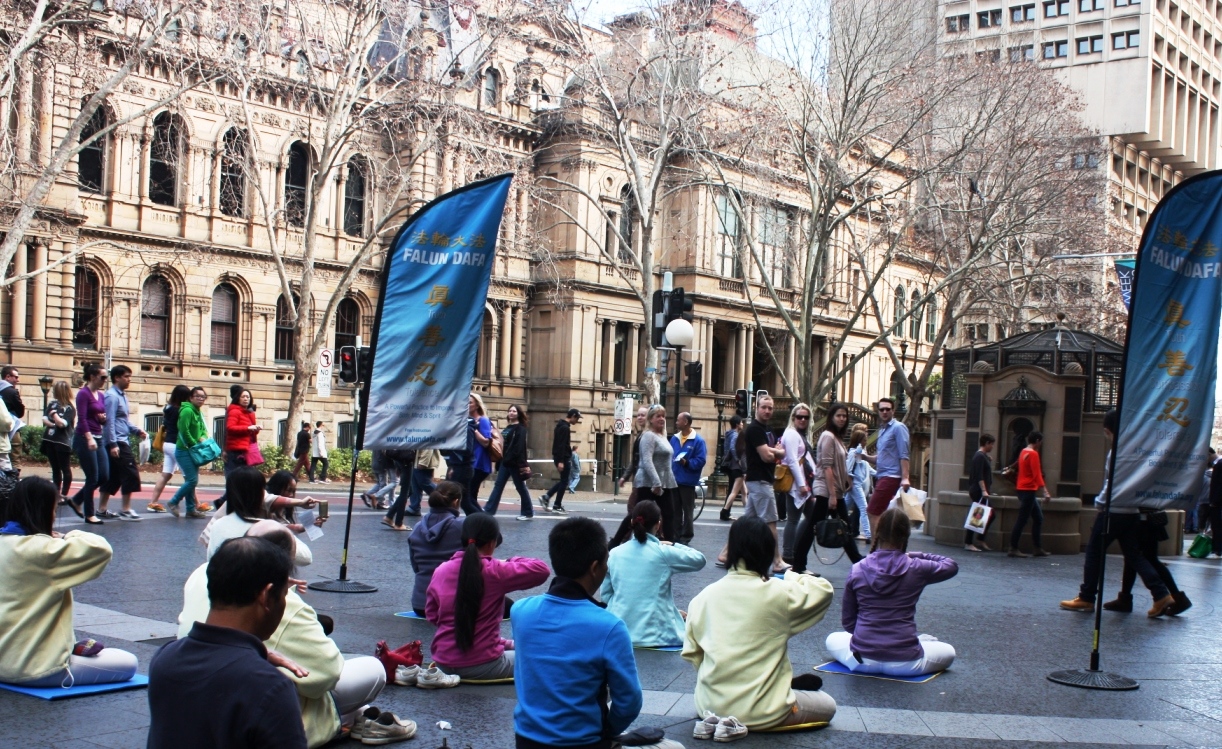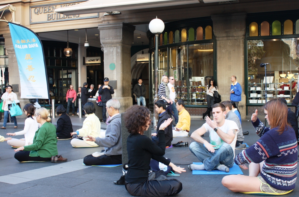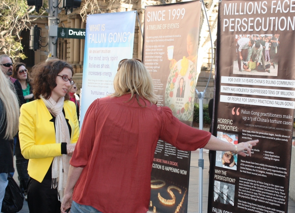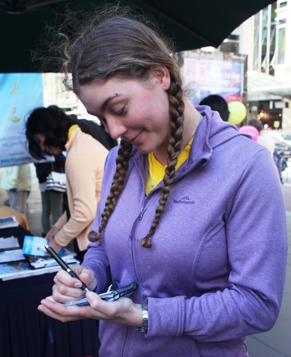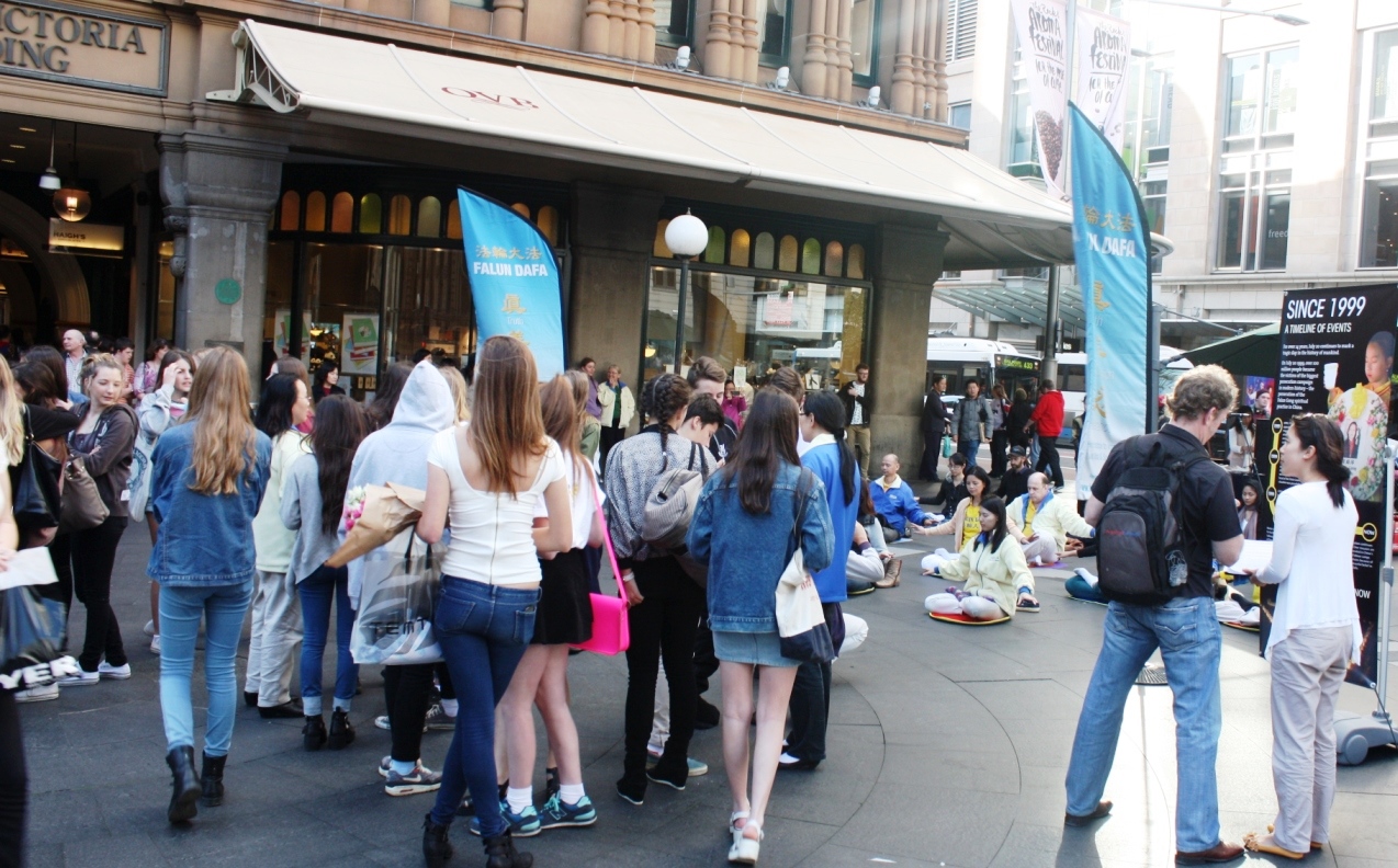 澳洲女士安西娅(Anthea)说她已经多次看到法轮功学员这样的活动。她说:“我已经很多次看到他们(法轮功学员)进行类似的活动。他们是非常平和的团体,我理解他们的活动,支持他们,我知道他们被迫害十四年,我也知道活摘器官的事情。我希望他们成功。”一群路过的学生看到法轮功学员演示功法,有的也加入一起炼功和打坐。当得知这么好的功法在中国受到十四年迫害和法轮功学员被活摘器官时,他们相继签名支持反迫害。有很多中国人也来了解真相和在征签表上签名。有来自中国大陆的中共官员也在真相展板前仔细观看,有的做了三:退.。很多中国留学生们驻足观看,并拿出手机将学员炼功的场面拍摄下来。一个非常年轻美丽的中国女孩子奎尼(Queenie)停下来看了一会,然后对法轮功学员说:“这是法轮大法,在中国是不能修炼的,不能象在这里表演的,是受到迫害的。”她妈妈告诉她说:“法轮功是很不错的,(在中国)都是中共诬蔑,其实法轮功是很好的。”她听后不但接下了所有真相资料,还在征签表上签了名。
