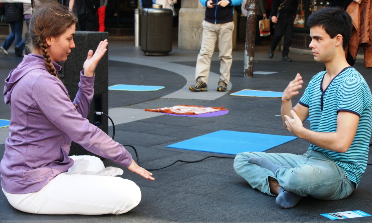 法轮功学员炼功的能量场把很多有缘人深深吸引,罗斯(Rus)和女友在现场学习功法,他说学炼中身体包括手指都有感觉。他说:“这是我第一次了解到法轮大法,很喜欢,在这里感受到很好的能量。”他的女友西沃恩(Siobhan)说:“我在办公室工作,工作压力大,在繁忙的奔波中静下来,什么也不想的炼一炼这个功法,非常美妙和放松。”他们表示回去后要下载炼功音乐,坚持学下去。