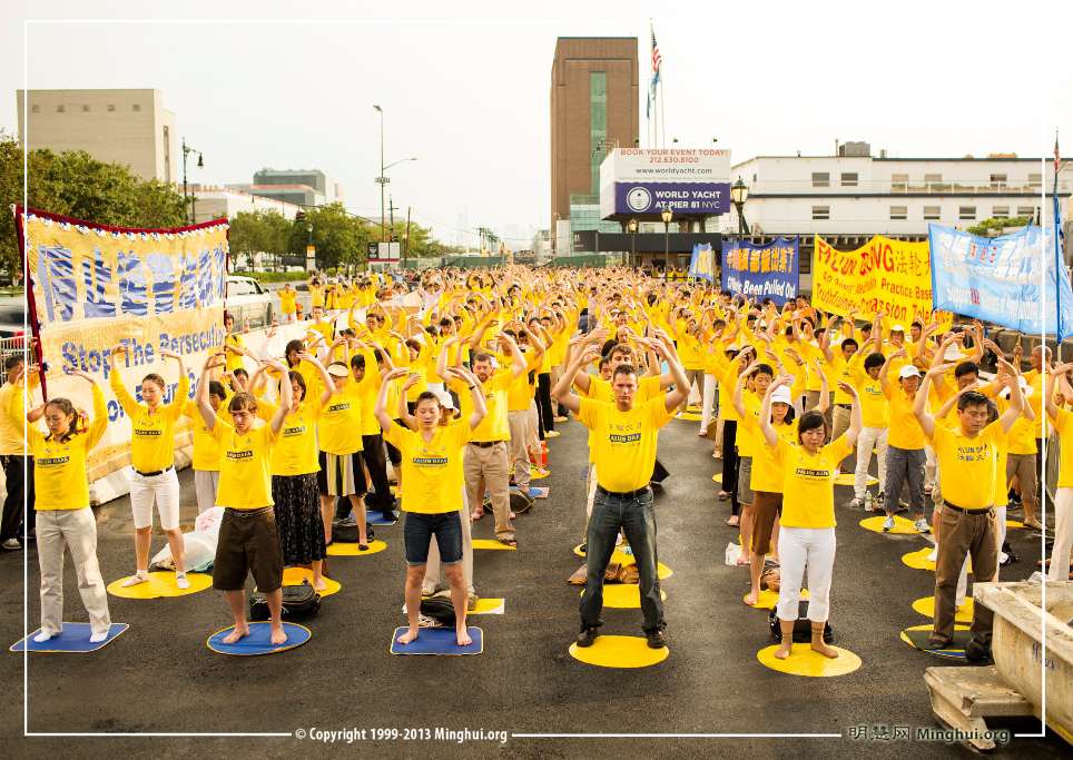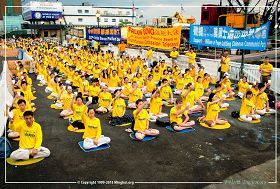 下午五点多,法轮功学员身穿印有“法轮大法好”字样的黄色T恤衫,整齐地排成数列,在悠扬的炼功音乐声中,炼习五套功法。他们打出“法轮大法好” 、“停止迫害法轮功”、“中共邪灵的根都拔出来了”、“中共劳教集中营活体摘取法轮功学员器官盗卖、焚尸灭迹、惨绝人寰、必遭天惩”、等中、英文横幅。现场气氛安静、祥和,数百人的抗议活动,不需要一名警察到场维持秩序。中途突然下了一场暴雨,但现场的法轮功学员并没为之所动,依然继续炼功、静坐。