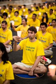 夜幕降临后,学员们点燃蜡烛,静静悼念那些在中国大陆被中共迫害致死的同修。暮色中橘黄色的烛光点点延伸开去,映照着现场人们慈悲、庄严的面容。不少在此地路过的西方人发出了敬佩学员反迫害的感叹。