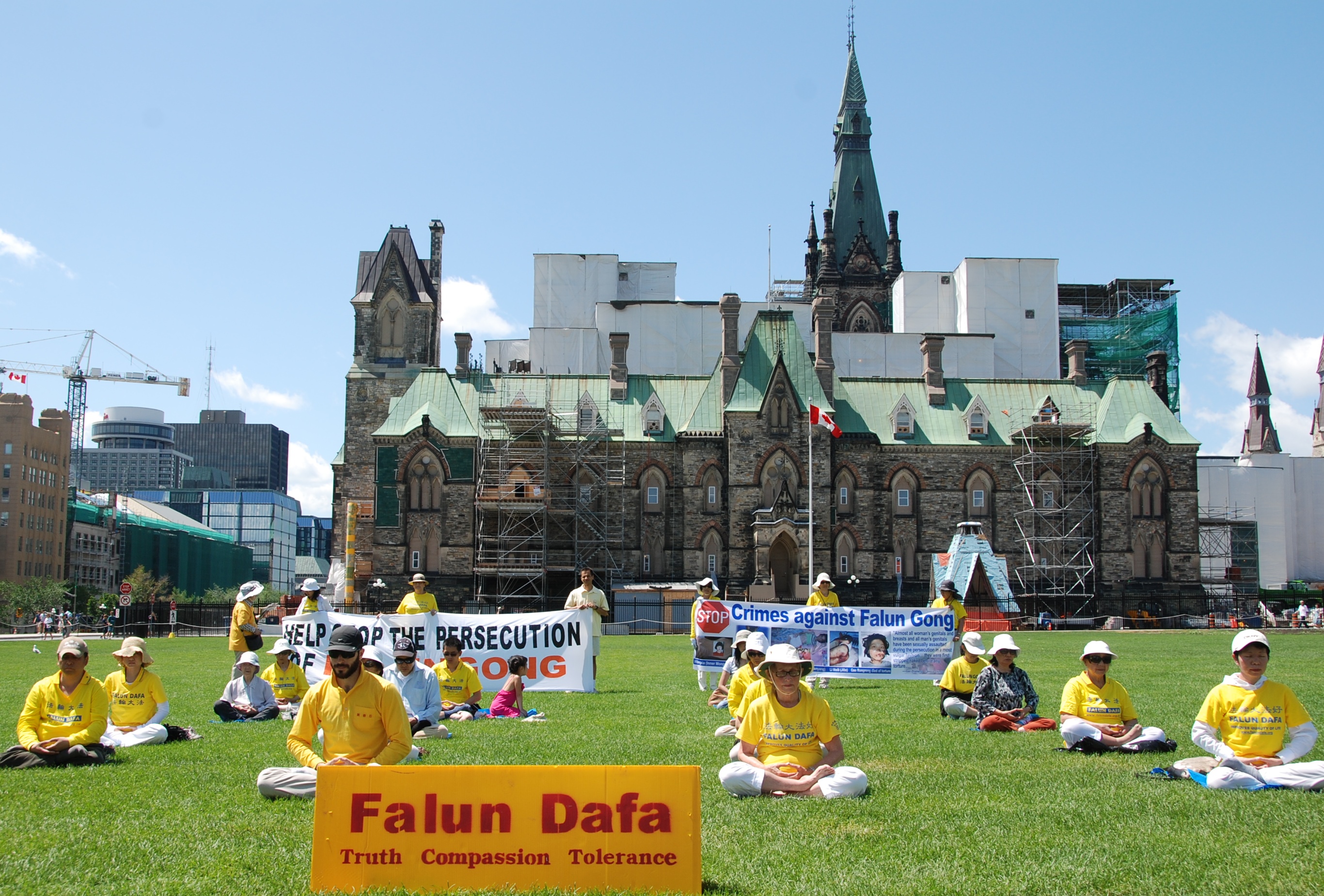 ![]() 图1:法轮功学员在加拿大国会山圣火边的草坪上炼功 |