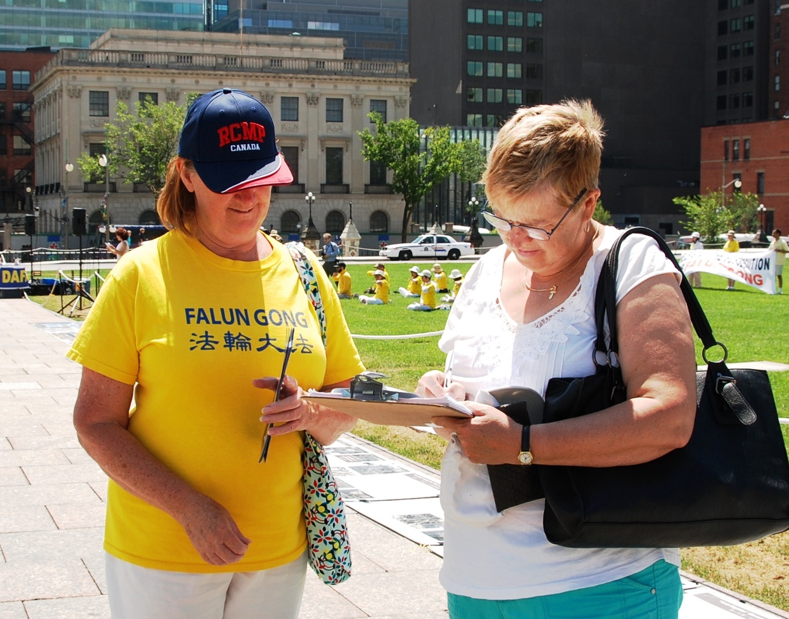 ![]() 图2:加拿大国会山前,路人签名声援法轮功反迫害 |