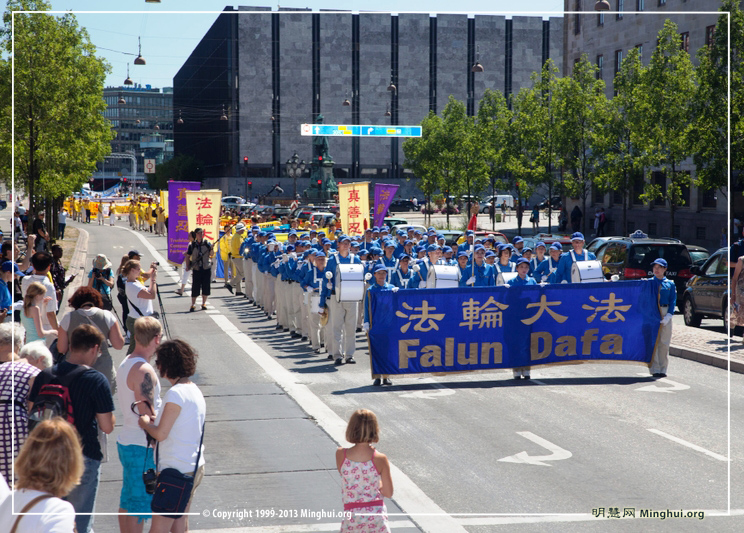 下午两点游行开始,声势浩大的队伍以天国乐团为先导,他们演奏乐曲“法轮大法好”、“法轮圣王”、“法正乾坤”、“法鼓法号震十方”、“送宝”、“欢乐颂”和“阿依达”,纯正美好的旋律震撼着人们的心灵。