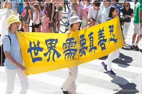 第二方阵的主题是法轮大法洪传世界,法轮大法洪传世界一百多个国家。“法轮大法好”,“真善忍好”,“世界需要真善忍”,越来越多的民众了解了法轮功。
