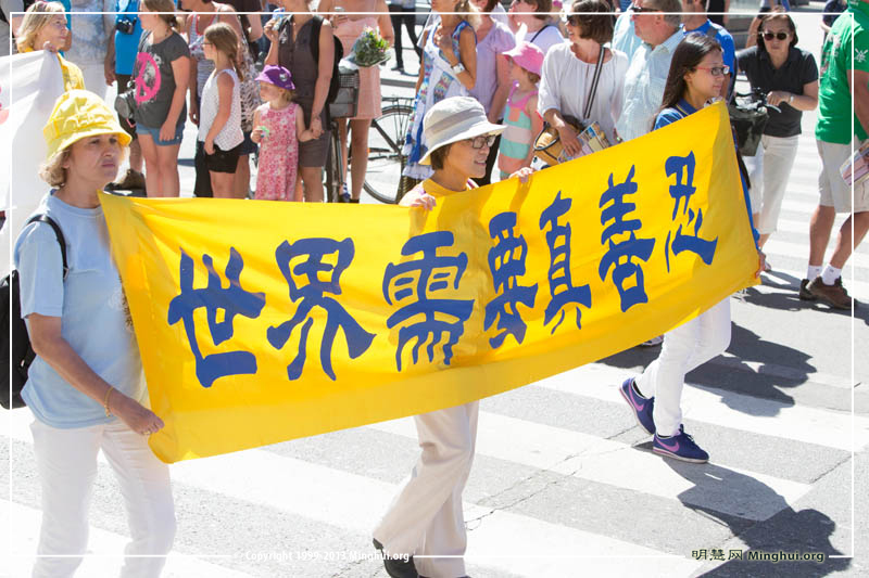 一位华人中年男子,在路旁拿着手机很专注地对着游行队伍拍摄,仿佛要把这些历史画面留住。他神情十分凝重。一位学员过去问他知道法轮功吗?他说知道一些,但没有看到过这么大的活动。正在这时,一位西方老人随着行進的队伍走了过来。学员告诉那位华人,这位丹麦老人已经八十五岁了,身体还这么好,有很多西方人也在炼法轮功。接着,穿白衣服学员的游行方阵走过来了,那位华人疑惑地指着学员手里的照片问:“这些都是什么人啊?”学员告诉他:“他们都是被中共迫害致死的法轮功修炼人。你看很多都很年轻,其中很多人被抓后没几天就被迫害死。至今经核实已经有近四千法轮功学员在中国被迫害致死。”那位华人很震惊,沉默了一会儿,一字一顿地说:“正道必行人间!”