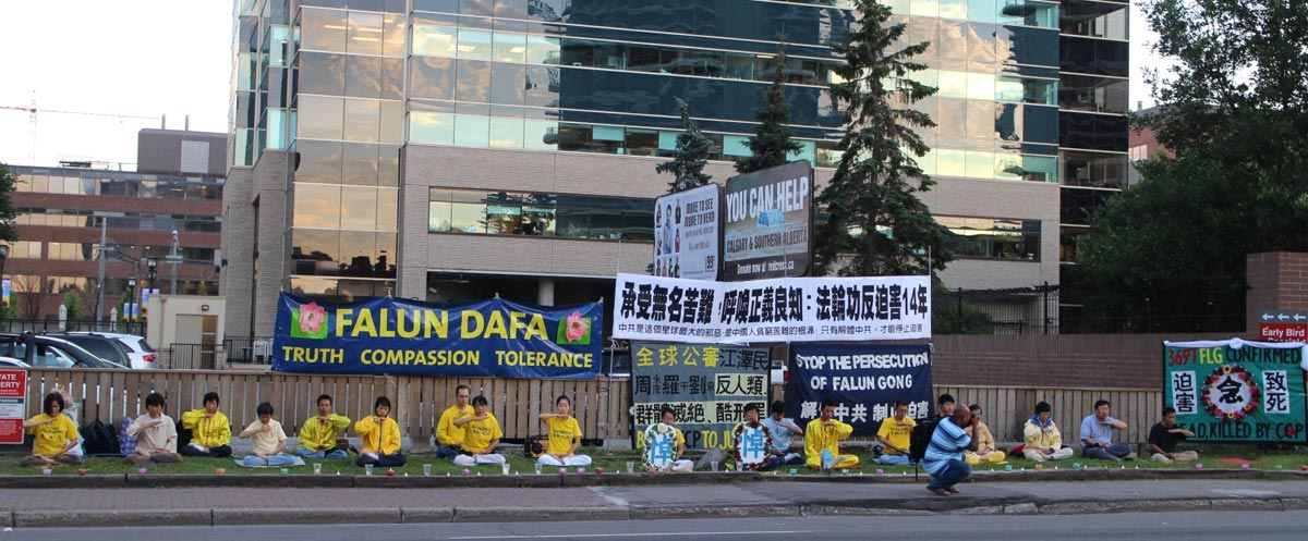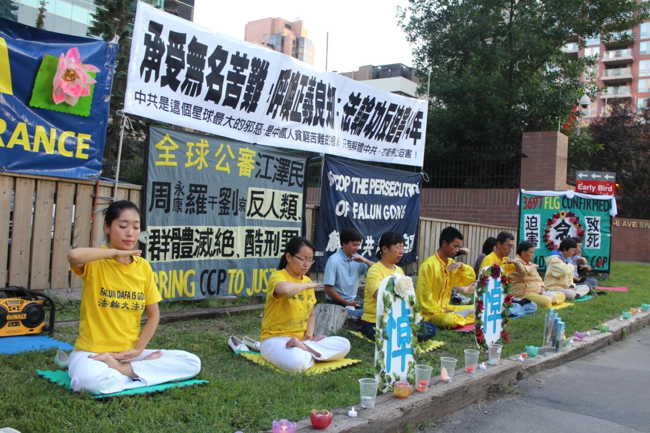 ![]() 图2-3:卡尔加里法轮功学员在中领馆前举行“七二零”烛光悼念 |