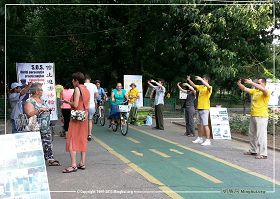【明慧网二零一三年七月二十三日】二零一三年七月二十日下午,罗马尼亚法轮功学员在首都布加勒斯特的海市特楼公园举行纪念反十四周年活动。活动中,部分学员给行人派发真相传单,部分学员在做功法演示,还有部分学员在为行人们讲解天安门“自焚”伪案的真相和法轮功学员在中国受到的十四年的残酷迫害的真相。有不少行人在揭露迫害的真相展板前驻足观看,他们对中共邪