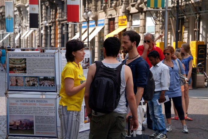 二零一三年七月二十日,意大利法轮功学员在米兰市中心集会,揭露中共的迫害。很多游客都主动上前了解详情,签名反对中共活摘法轮功学员器官的罪行。