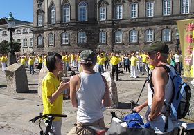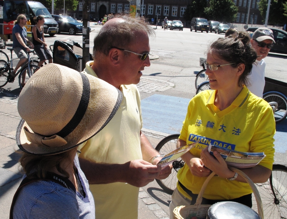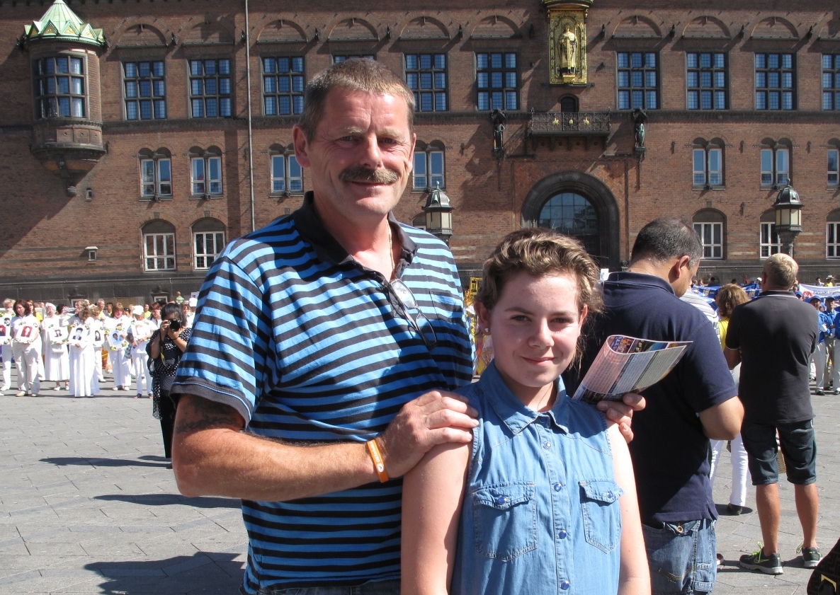 来自一个丹麦小镇的鲁诺(Luno)和路易莎(Louisa)父女俩恰巧来到哥本哈根议会广场,看到了欧洲法轮功学员在那里举行的反迫害集会。他们在身穿白色服装、手捧被中共迫害致死同修遗像的女学员方队前面停留了很久,以前就听说过法轮功真相的父亲给第一次看到法轮功的女儿耐心地做着解说。正在读中学的路易莎马上告诉父亲,她要把法轮功被迫害的故事作为她下次交给学校的每月报告作业的内容。正在一旁的法轮功学员问她为什么做这样一个决定时,爸爸鲁诺马上替女儿回答:“让人们了解到底发生了什么非常重要。(中共)这样(迫害)完全错了,可是他们还在迫害,应该让大家了解这个。”