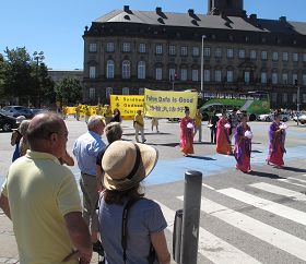 当天的游行队伍由天国乐团、法轮大法弘传世界、停止迫害及制止活摘器官和三:退.(退!党!、退*团-、退*队-)保平安四大部份组成的法轮功游行队伍浩浩荡荡地穿行在哥本哈根市中心的街道上,延绵几个街区的游行队伍犹如一个流动的法轮功真相长廊把真相带到人们面前。天国乐团震撼人心的演奏、伴随“法轮大法好”歌曲翩翩起舞的仙女、模拟演示中共活摘法轮功学员器官的展车、身穿金黄色传统服装腰鼓队击出的有力鼓点以及“法轮大法好”的呼声,丰富而生动的真相信息全方位地冲击着路人的心灵。