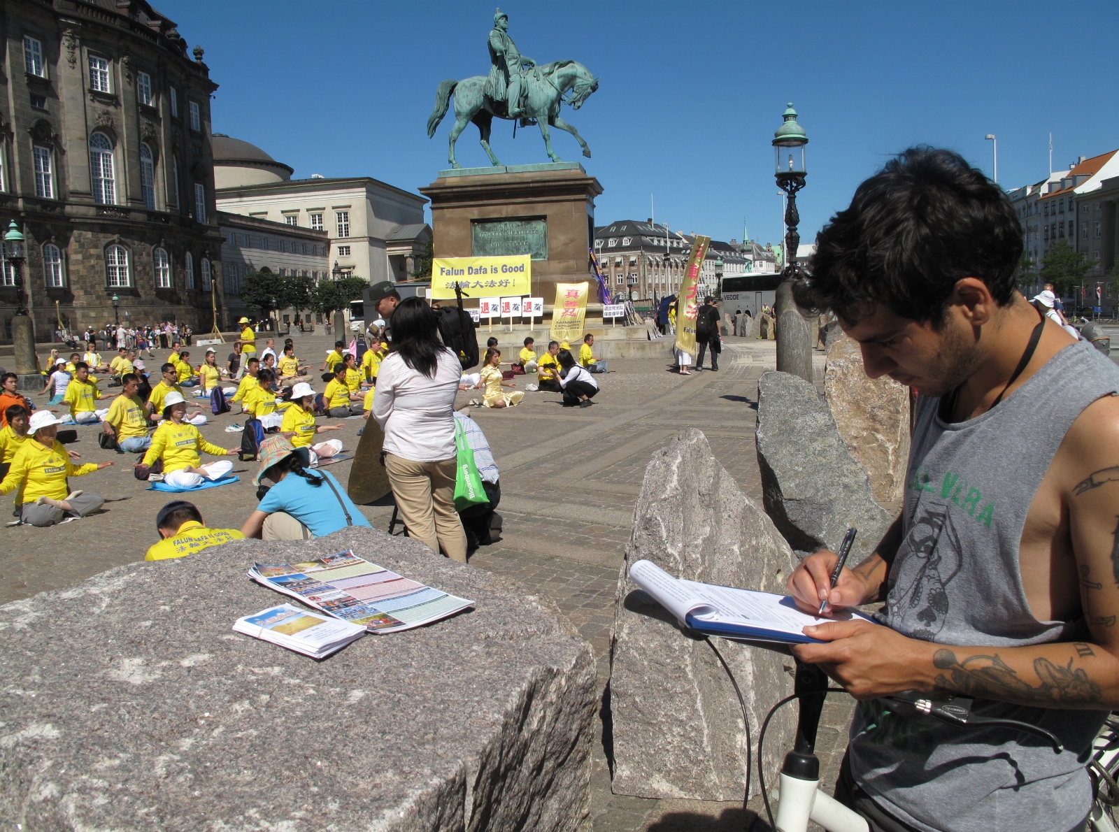 圣地亚哥是来自阿根廷的小伙子,曾在阿根廷学过电影制作专业,最近一年来临时在丹麦哥本哈根工作,他对佛教感兴趣,曾经每天打坐。当日中午,他骑车路过国会广场,看到数百位身着黄色T恤衫的法轮功学员在一起炼功打坐的场面,宁静祥和的能量场立即吸引住了他。
