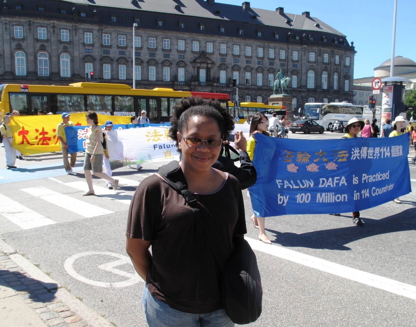 当天下午二时,法轮功游行队伍从国会广场出发,在第一个十字路口,一位非洲裔女士用自己的iPAD摄下声势浩大的法轮功游行队伍。这位女士是在南非一所大学里教英文的美国女士瓦瑞娜(Wahrena),她以前听说过法轮功,这次是来哥本哈根旅游,再次遇到了法轮功。她说法轮功功法非常祥和,让人平静,很令人向往,而法轮功学员进行的传播真相反迫害活动非常令人钦佩。
