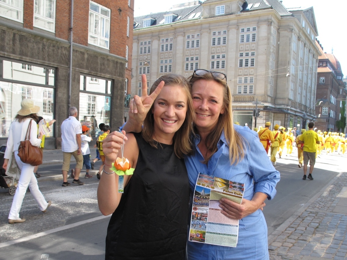 游行队伍经过时,哥本哈根一家珠宝店女老板,丹麦女士简(Jane)和她的助手莎碧娜(Sabina)被天国乐团演奏的雄壮乐声吸引,走出商店,站在店门口认真观看。一幅幅法轮功真相生动地展现在她面前,看着看着,两个人眼眶红了,珍妮更是被感动落泪。见到记者时,她们两人争相表达着自己的感受:“太感人了,这么多人、来自这么多国家,太不容易了!”“好人却被迫害,实在是太糟糕了!”“对我们生活在自由世界的人来说,对别人进行这样残酷的迫害,太令人难以置信了。”“法轮功的(真善忍)原则是二十一世纪最需要的。”“这是非常好的让人了解真相的方法,这里还有乐团、音乐、古装(天女队)……,所有的内容组合的很好、非常非常美。”“想到在(中国)那里人们被如此剥夺了基本人权,我的眼泪就要上来。”