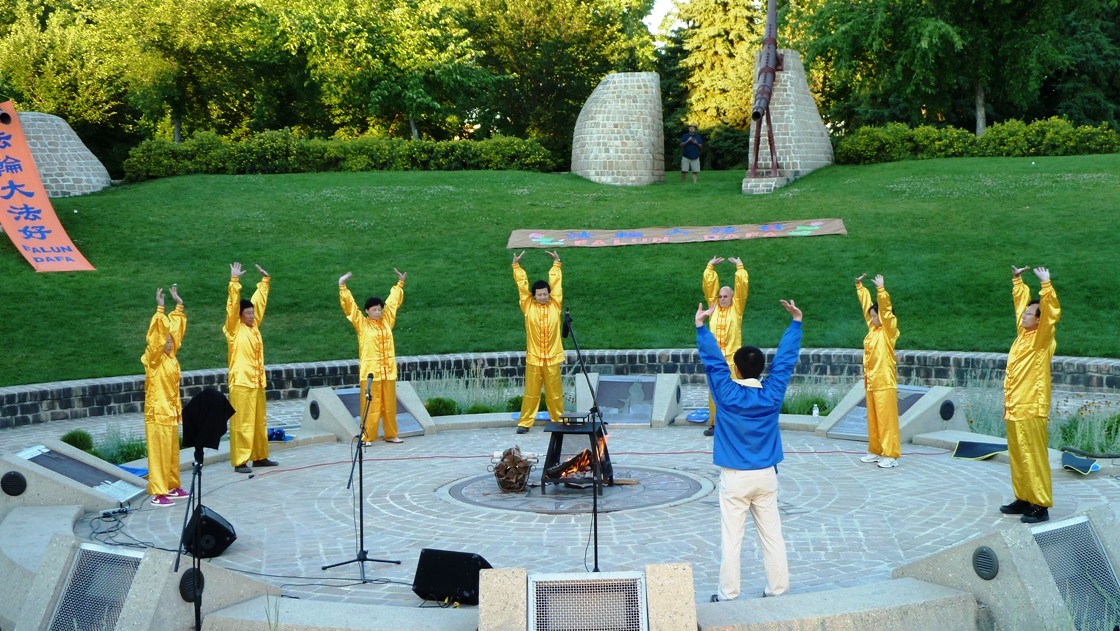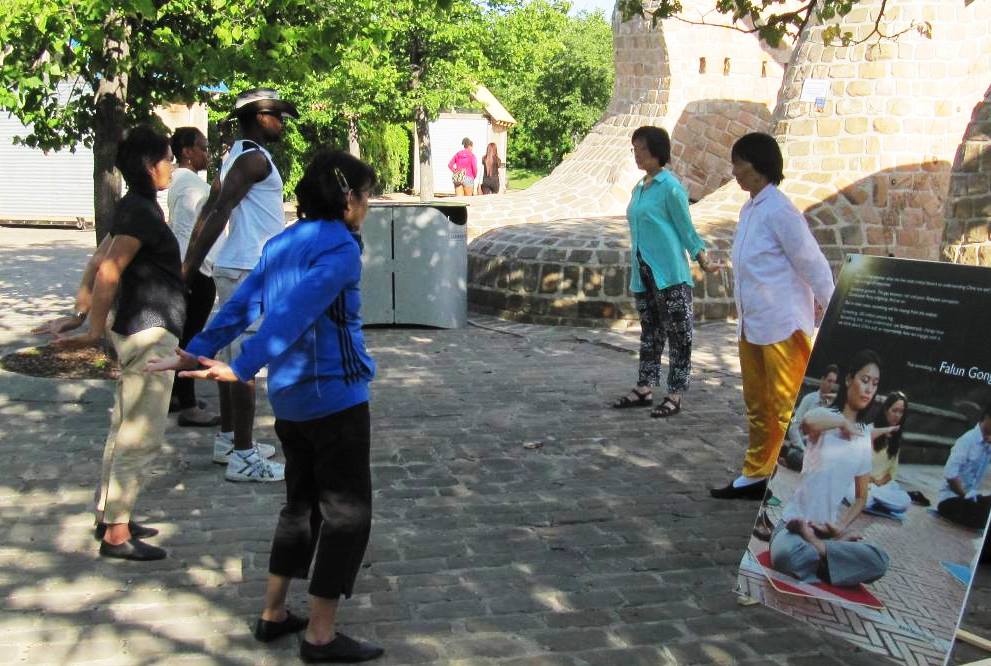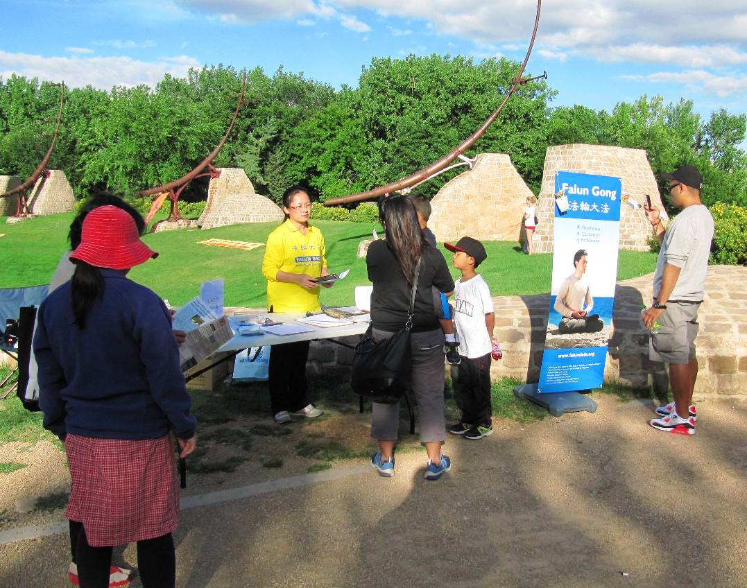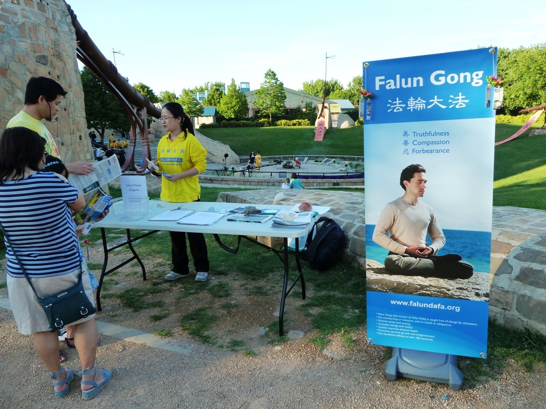 当法轮功学员在台上做功法展示时,还有一位西人坐在看台顶端从头到尾跟着法轮功学员学做动作,并坚持到活动结束,然后跑到我们展台来在请愿书上签了名,并和法轮功学员交流了许久。他说他很理解法轮功的反迫害的行为,对法轮功学员的遭遇深表同情,而且拿了些资料回去说要给他的亲戚朋友说这些真相故事。法轮功学员很感谢他的理解和帮助,并说反迫害活动不仅是要停止迫害,还要唤醒人们的良知。