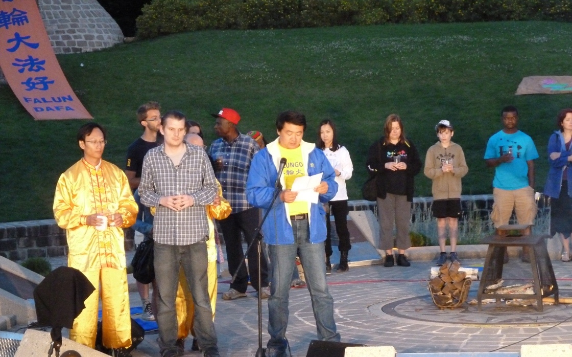 晚会一开始由法轮功学员代表介绍法轮功在中国受到的迫害情况,并由笛子伴奏作为背景音乐,吸引了不少游客前来观看。