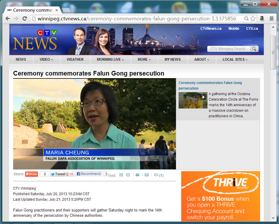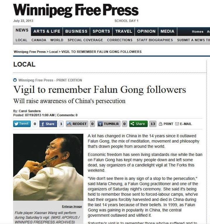 这次烛光悼念活动在温尼伯当地的Winnipeg Free Press报纸,CTV 电视台和加拿大广播电台CBC三大媒体都有报道,经过法轮功学员十四年在全世界坚持不懈的讲真相,揭露中共的迫害和欺世谎言,越来越多的人明白了真相,而且随着《·九·评*共产党》发表后掀起的退!党!大潮,越来越多的中国人也不再愿与共产党为伍。从最近几次的反迫害征签活动可以感觉到,以前那种受共产党欺骗而敌视法轮功的人现在是明显减少了。共产党对法轮功的无理迫害已经越来越失去民心,最终必将在可耻中收场。