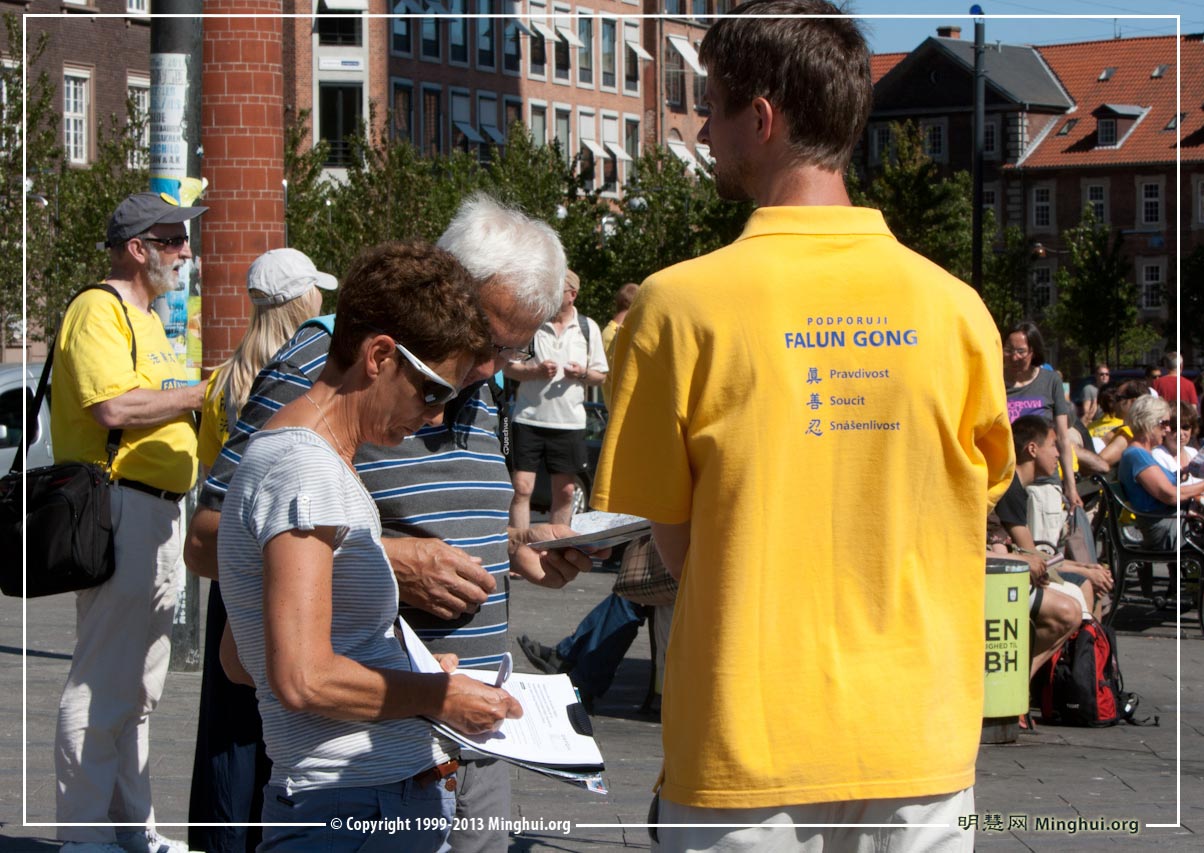 一位丹麦人在市政广场看到集会场景,听到了有关中共活体摘取法轮功学员器官的发言,马上找正在征集签名的法轮功学员,要求签名,适逢签名表格用罄,他又连忙到其他法轮功学员那里去找签名表,迫切地要表达自己反迫害的心声。